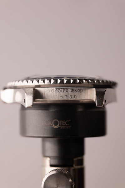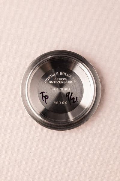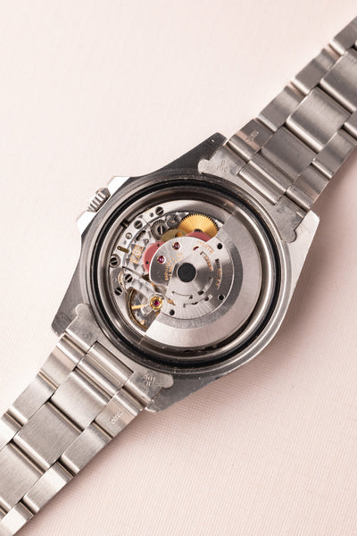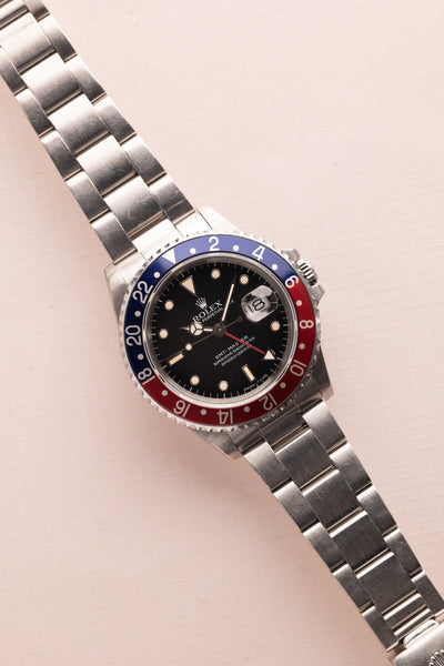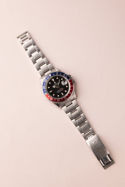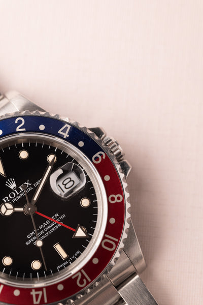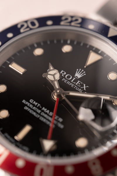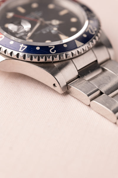 Description: The pepsi GMT is an iconic watch and the 16700 serves as the bridge between modern GMT’s and vintage gmt’s. This GMT has a light yellow patina on the tritium lume and the insert has faded a few shades lighter leaving a very iconic vintage pepsi GMT look. The case appears unpolished with factory bevels still present