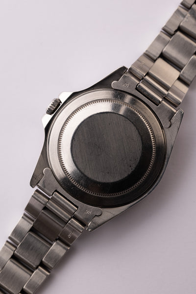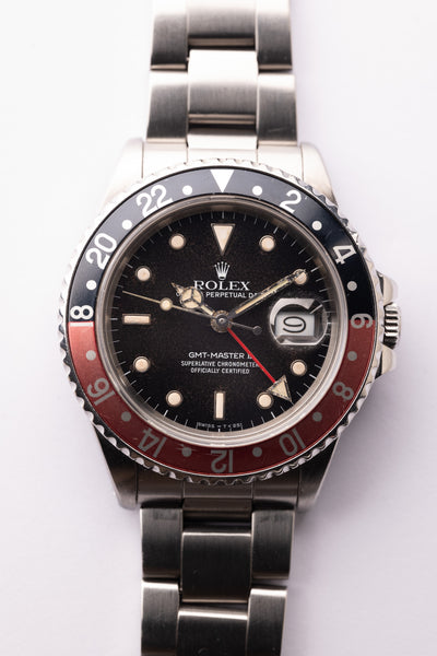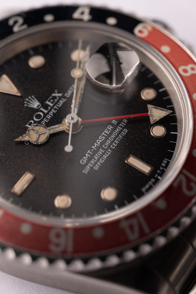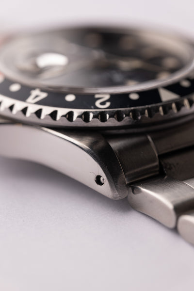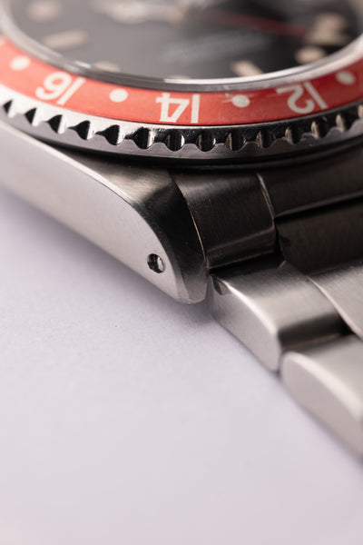 Description: One of the rarest GMT references can be considered the 16760 otherwise known as the “Fat Lady.” The nickname was attributed to the increased case size around the lugs and crown guards as well as the overall thickness height of the case. Produced for only a few years and only in a coke bezel variant, these watches were overlooked in the past. Not only does the case size give the watch a completely different feel when compared to their thin counterparts, the coke bezel separates any confusion one may have mistaking it for a regular pepsi GMT. This watch has an excellent faded bezel and the dial has begun to fade out to a warm tropical texture. The case is in excellent shape and has previously been polished. Hands have been stabilized on the back side to prevent any further deterioration