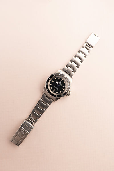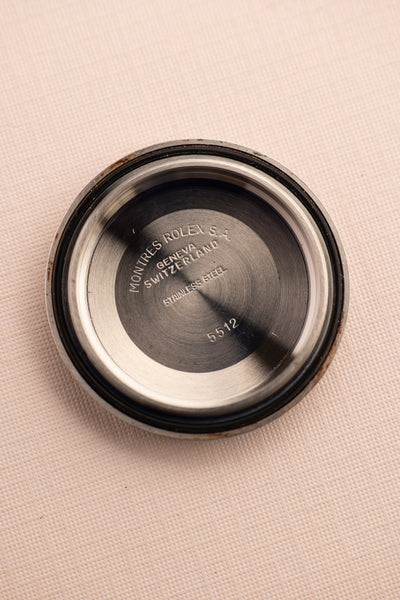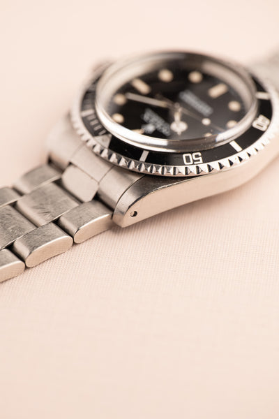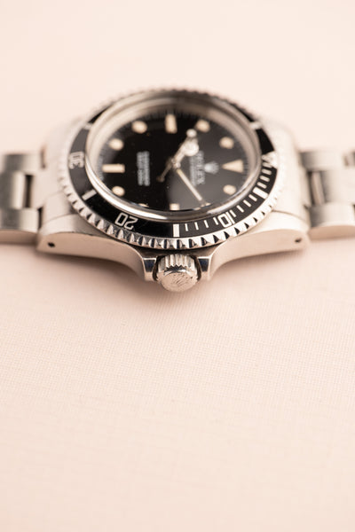 Description: Perhaps more interesting than a 5513 matte dial sub is a transitional one with a transitional gloss dial encased in a plexiglass case. This sub has a lot of character and has consistent coloring throughout the hands and dial.