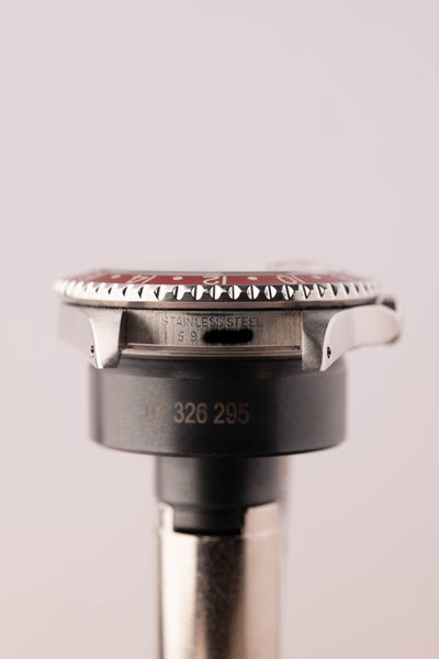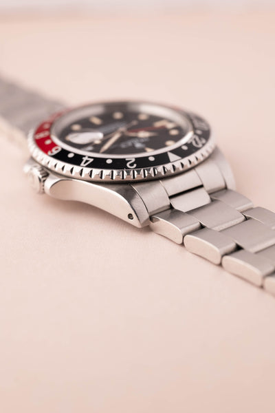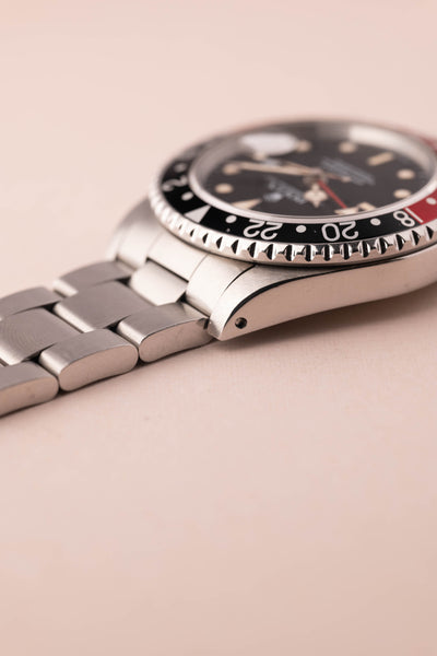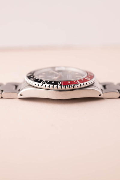 Description: its hard to argue that the Coke insert 16710 has surged in value over the years. One can only imagine what will happen to prices if Rolex will reissue a ceramic coke GMT over the next few years. This Coke GMT has a beautiful glossy dial with very creamy lume plots. The yellow lume plots will not be mistaken for any newer luminova GMT.