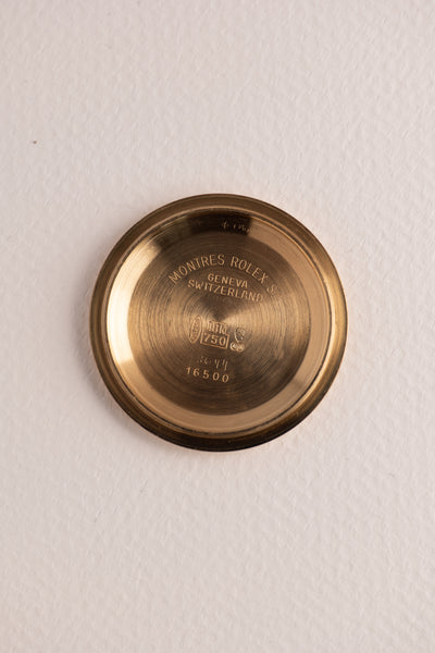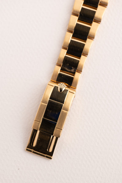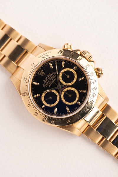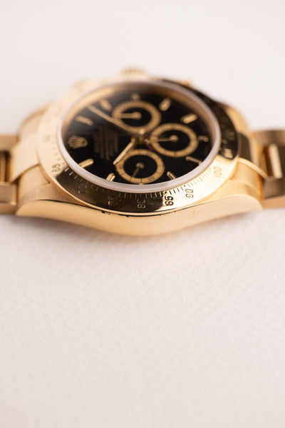 Description: Those that chase after Daytona’s all consider the Zenith movement 1652X series as the best of the modern Daytona’s. Excellent condition ones have been bought and put away rarely to be seen. Out of those Zenith Daytona’s, the Inverted 6 dials have had a near cult following. On the middle subdial, Rolex originally printed these with an upside down “6” and later corrected them to a proper 6. The fact that this watch is the black dial with gold variant and the inverted 6 dial makes it a grail watch to most. Add in box and papers and you’ll be lucky to find any other comparable for sale.