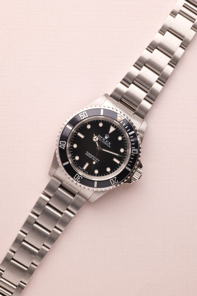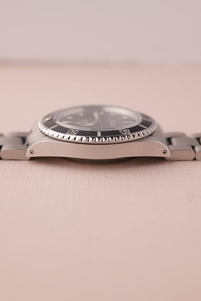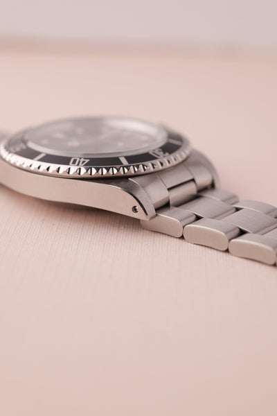 Description: Out of the Neo-Vintage watches that have gained tremendous popularity over the past few years perhaps none have been more overlooked than the 14060 no date Submariner. Produced in far fewer numbers than the more popular 16800 reference, this Sub model provides a clean symmetrical dial without cluttering up the face of the watch with a date function or cyclops. The case has been lightly polished in the past but retains sharp and even bevels throughout the case. This model is also a tritium dial variant which is reflected by the creamy lume on the dial. Case begins with an N serial