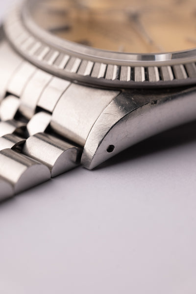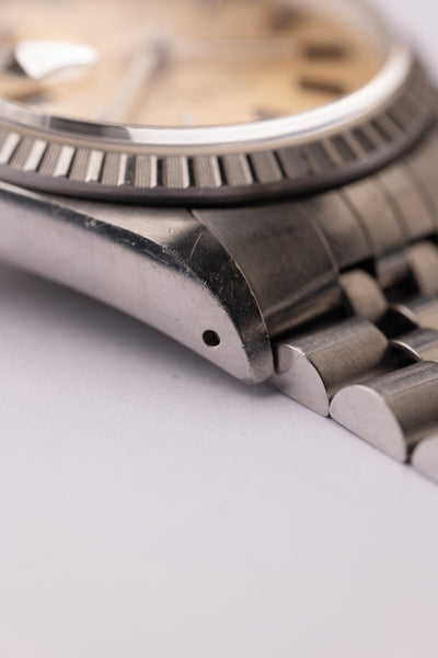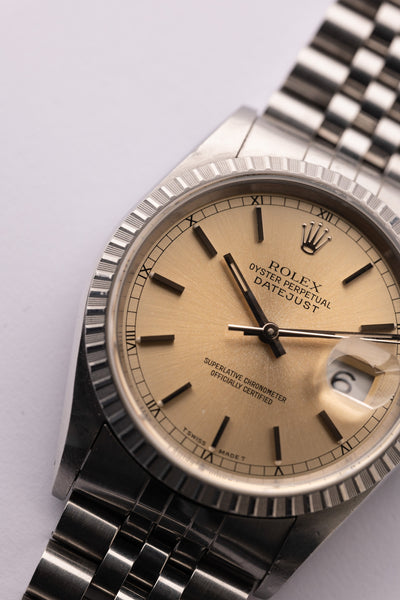 Description: As watch manufacturers over the years pushed for bigger and bigger watches, we are finally see the contraction effect happening, Get ahead of the curve and situate yourself in a 36mm or 34mm Rolex as these are amazing sizes that wear bigger than their size would suggest. This 36mm 16220 Datejust is about as clean as they come, with a beautiful tropical dial, to the excellent condition case. The case appears unpolished as well, appearing very sharp and thick. Original Case back sticker still on the watch.