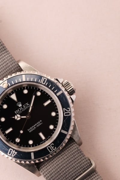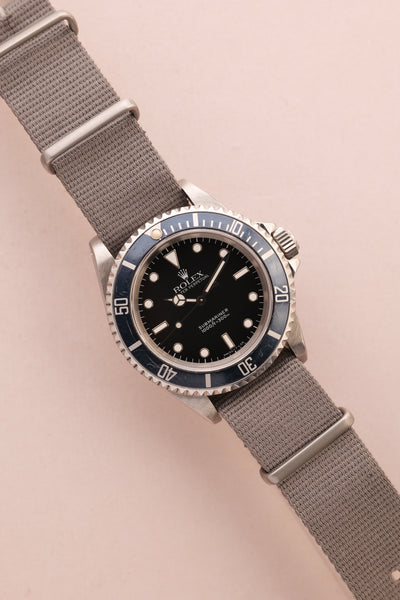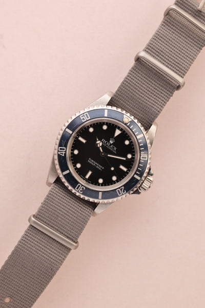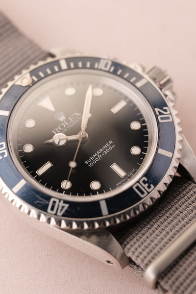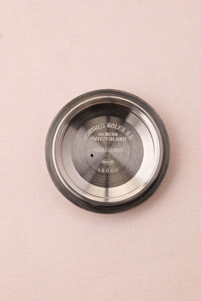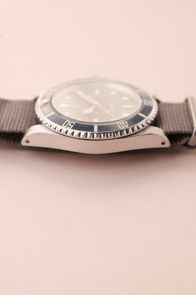 Description: Out of the Neo-Vintage watches that have gained tremendous popularity over the past few years perhaps none have been more overlooked than the 14060 no date Submariner. Produced in far fewer numbers than the more popular 16800 reference, this Sub model provides a clean symmetrical dial without cluttering up the face of the watch with a date function or cyclops. Unpolished case and deep glossy dial make this 14060 one not to pass up