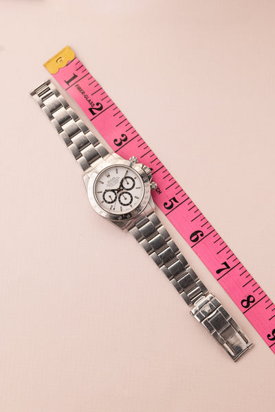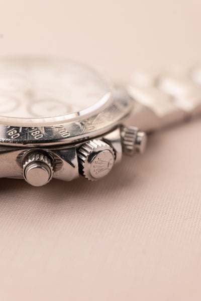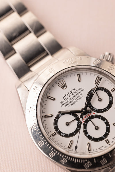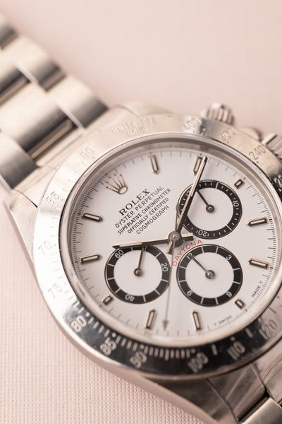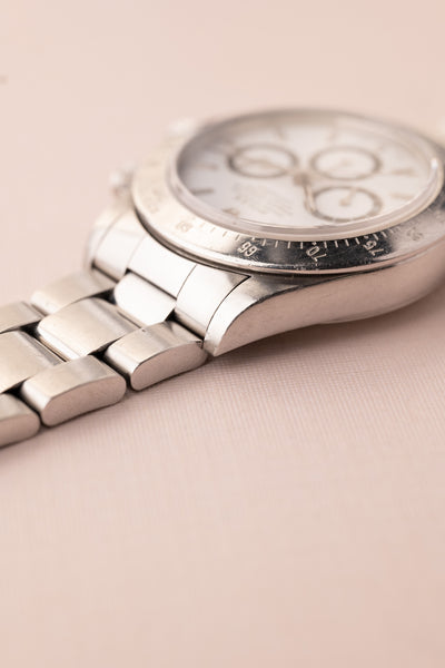 Description: The 16520 can be considered the 993 generation Porsche of the Daytona line up. It has a robust Zenith chronograph movement and was the first 40mm Daytona to be introduced to the Rolex line up. The white panda variant dial for us is the rarer white dial variant, as the other white dial has silver sub dials The case is in excellent condition that appears that may be unpolished given the sharp bevels on the lugs. We except this white panda dial to catch up to the premium pricing of the black dials.