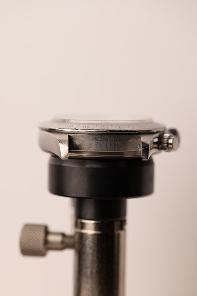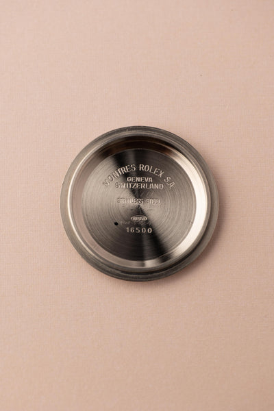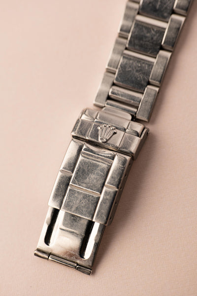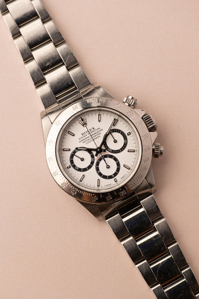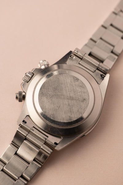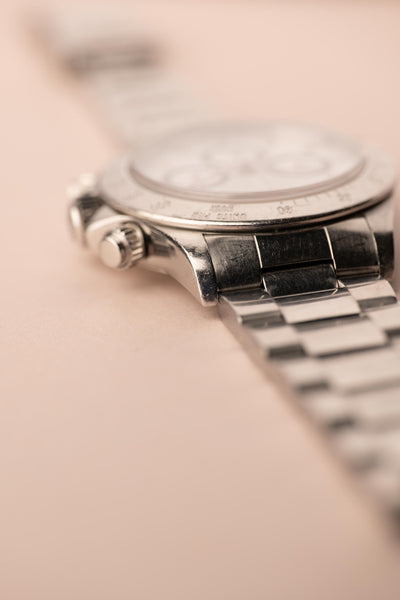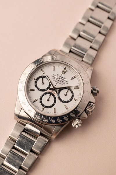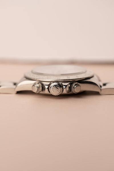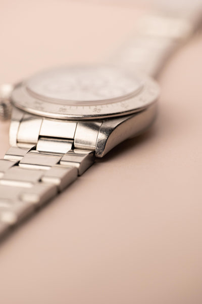 Description: The 16520 can be considered the 993 generation Porsche of the Daytona line up. It has a robust Zenith chronograph movement and was the first 40mm Daytona to be introduced to the Rolex line up. The white panda variant dial features a 6 that appears inverted on the 6 o’clock sub-dial. The case is in excellent condition that appears lightly polished but this is very hard to determine as the case has very sharp bevels that could have just been sleeve worn. The enamel paint inside the bezel has worn off leaving a ghost like appearance. This doesn’t effect the watch as most daytona’s of this era has some enamel loss and is easily replaceable. To us, we actually dig this ghosted look.