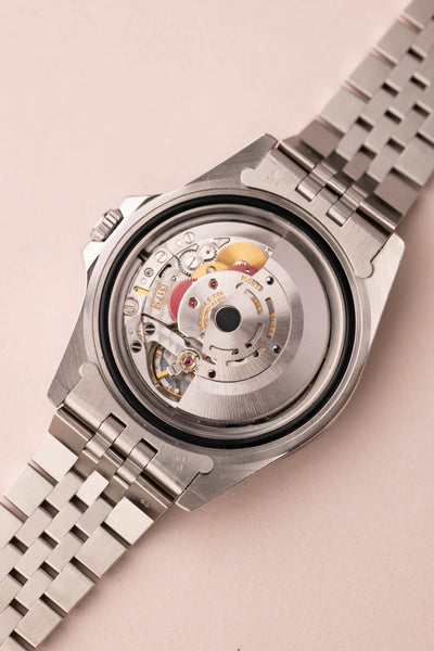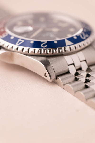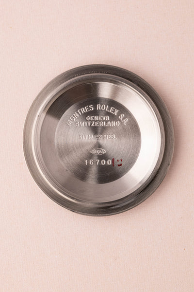 Description: The 16700 sits between the 16750 and 16710 and serves as a transitional watch to the modern GMT’s we know today. This reference was right before Rolex introduced a new movement that featured a jumping independent hour hand. This specific 16700 is joined by a beautifully tight jubilee bracelet and a creamy tritium dial. The case has been recently polished but remains thick with sharp beveling.