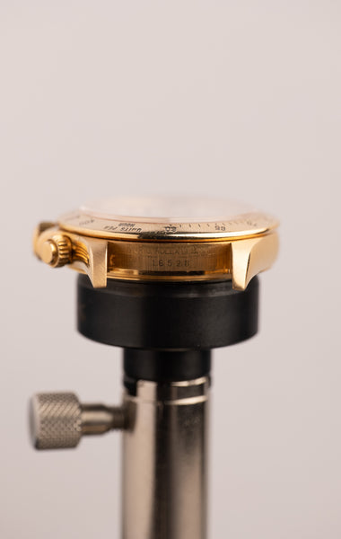Description: This white diamond dial Daytona is our favorite dial variant of the 5 digit Daytona. Not only is the outer plots beset with factory Diamonds, the sub-dials have a panda outer ring and white inner. The “inverted 6” variant (bottom subdial 6 is inverted to look like a 9) Diamond dial is one of the more rare variations of the 16528. The case is in excellent condition and may have been lightly polished once in the past but remains thick and even through the crown guards and lugs. T serial.