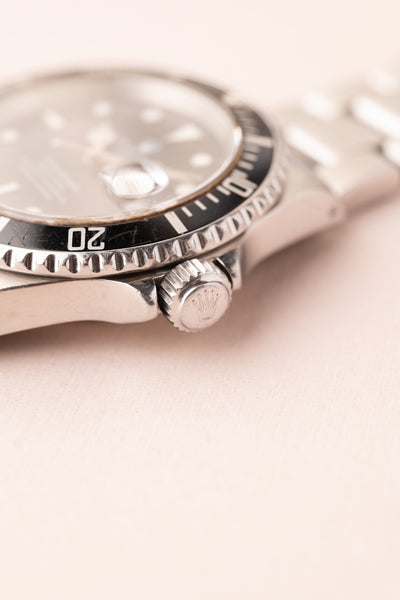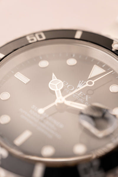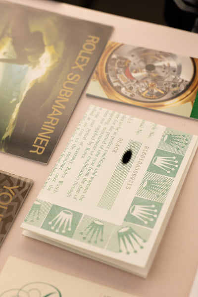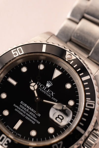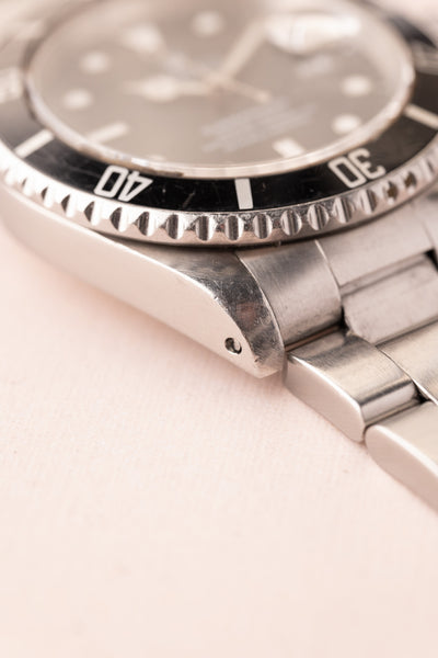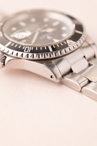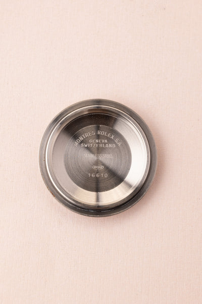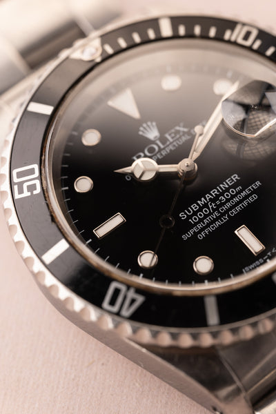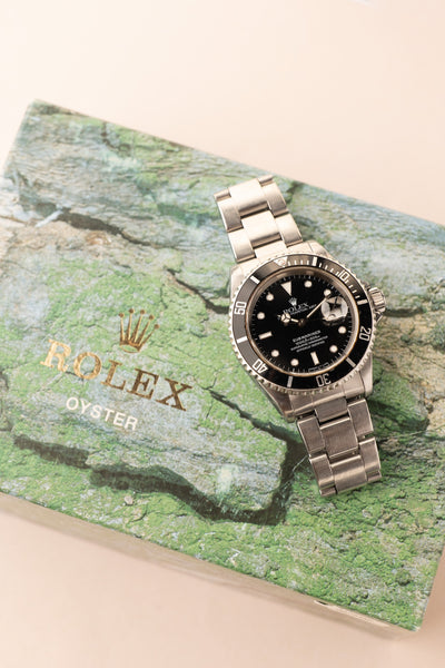 Description: 1997 Rolex 16610 full set with tags papers and box. This tritinova dial is unique to U serial sports Rolex’s of this time. Even thought the dial is marked “t-swiss-t <25” there is in fact no tritium and instead luminova lume was introduced on this transitional watch. The case appears sleeve cuff polished over years of wear but remains very thick and appears unpolished with faint original bevels still present