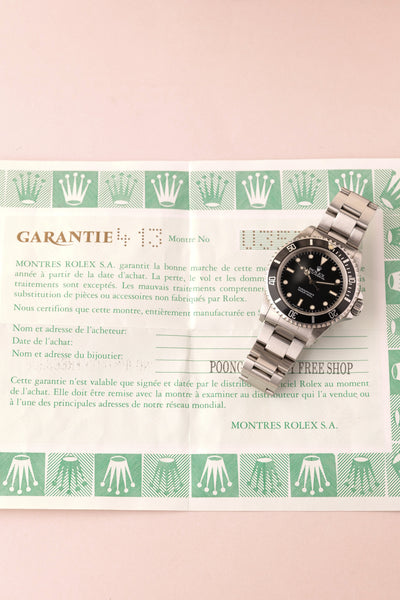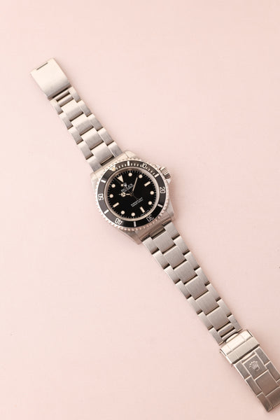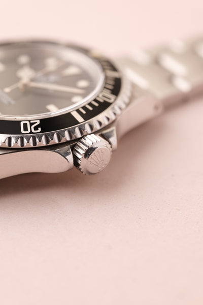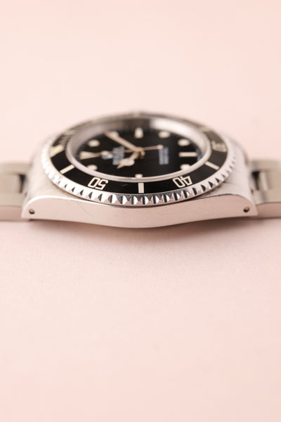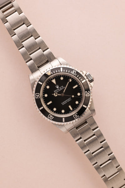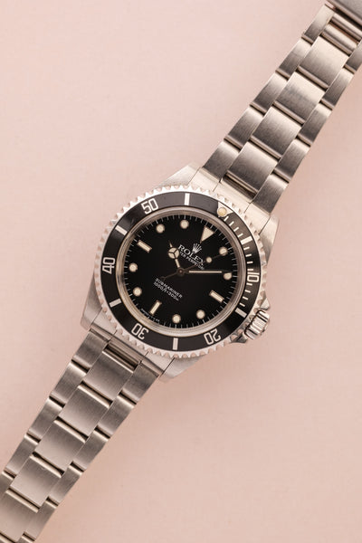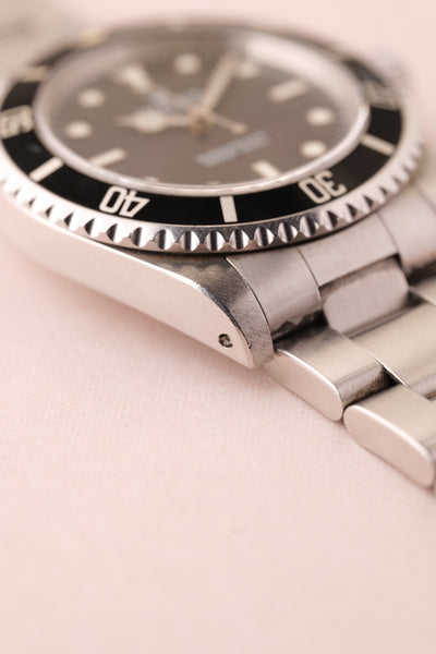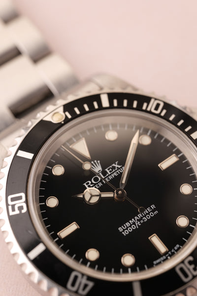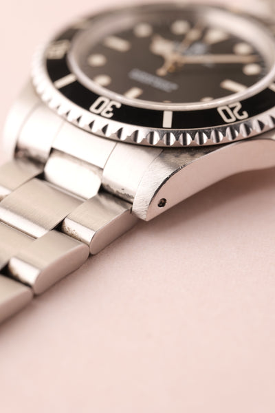 Description: Out of the Neo-Vintage watches that have gained tremendous popularity over the past few years perhaps none have been more overlooked than the 14060 no date Submariner. Produced in far fewer numbers than the more popular 16800 reference, this Sub model provides a clean symmetrical dial without cluttering up the face of the watch with a date function or cyclops. Unpolished case and deep glossy dial make this 14060 one not to pass up. This watch comes complete with box and papers.