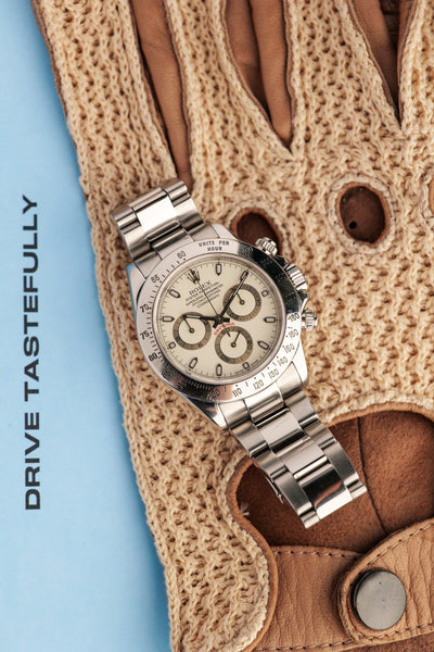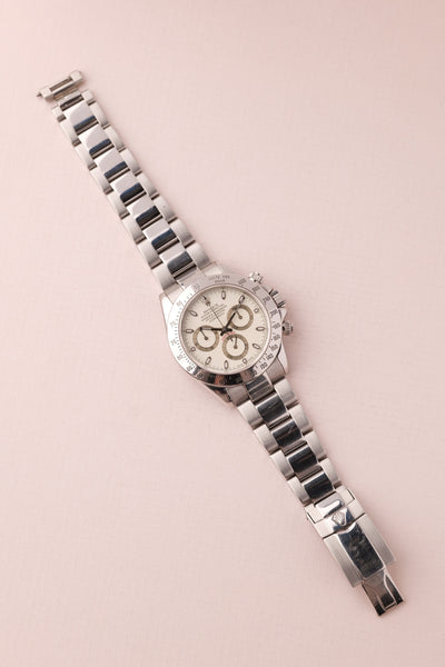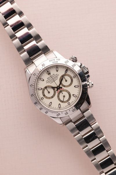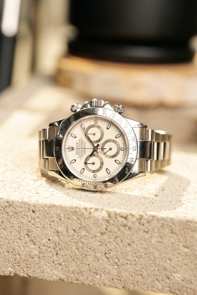 Description: Very Rare “Panna Cotta” Dial Rolex 116520. Nicknamed after the sweet creamy beige desert, this dial is rarely seen in this reference. Only a few white dials achieve this creamy hue color and is highly desired amongst collectors. Excellent dial and case.