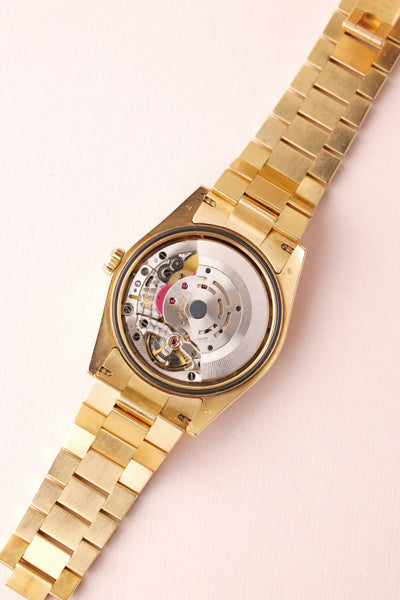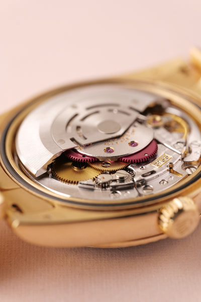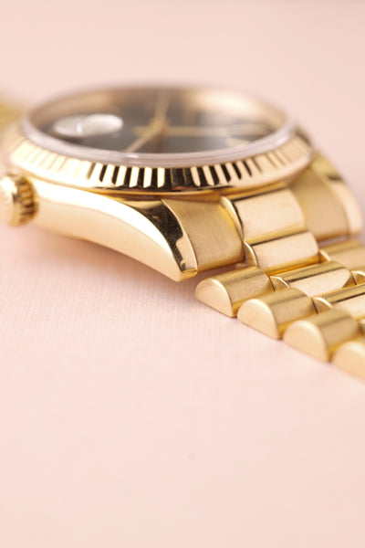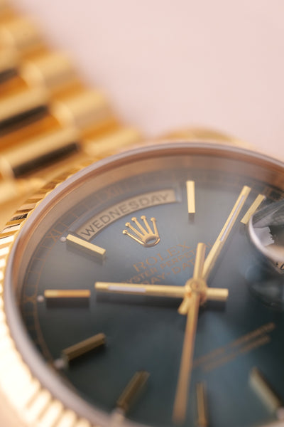 Description: The 118238 is a future classic. This Day-Date model feels surprisingly modern due to its heft and size however, the shape and feeling gives off a very vintage vibe. This brushed navy colored dial is also a very rare bird. Most are produced in a smooth satin finish and are not this same shade of blue. The case appears unpolished and remains thick and even throughout the case .