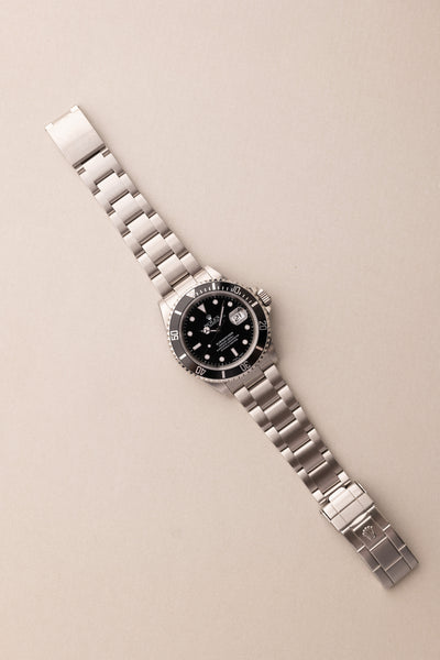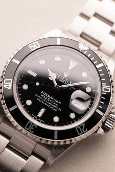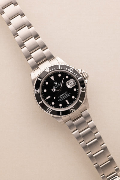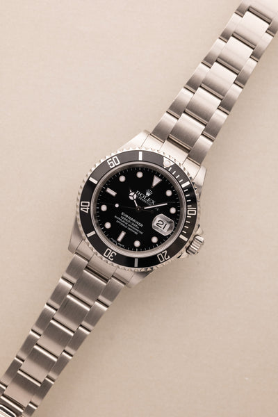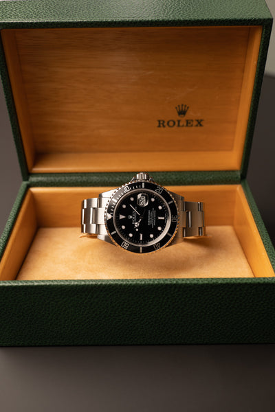 Description: 2001 Rolex 16610 full set with tags papers and box. This luminova dial is in excellent condition, The case appears sleeve cuff polished over years of wear but remains very thick and appears unpolished with faint original bevels still present - Original box and papers included.
