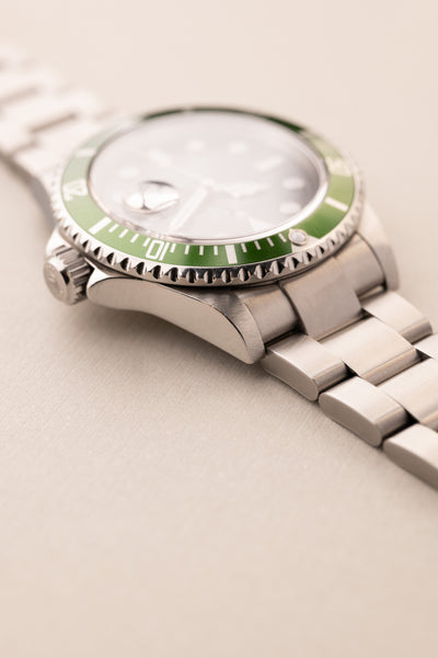 Insert: Original B1: Fat Four “Serifed”, the inside of the four in ‘40’ is squared at the top but all the numbers with internal angles have very sharp, pronounced serifs in the classic Rolex style. The bezel is of a slightly lighter, olive green than the bezels that follow. (nicknamed Bertolli).