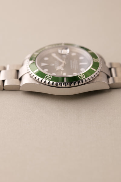 Description: Why does a vintage rolex specialty store carry modern Kermit sub’s? Well simply because we believe this to be one of the last great Sub’s made with true vintage variances. There are multiple variations of dials, cases and bezels. The move to ceramic inserts make the Rolex line up very uniform. Gone are the inserts that will fade and patina over time. The original anniversary Submariner, the 16610LV is the first Green variant of the Submariner and due to it using the last aluminum inserts, will continue to evolve and get better over time. This Kermit is watch only and sports a light cactus green insert. This is the perfect Sub to stand out of the sea of modern ceramic sports watches. Watch only, with an outstanding case.