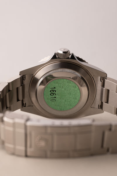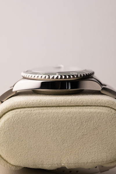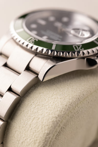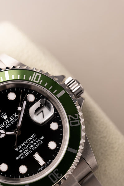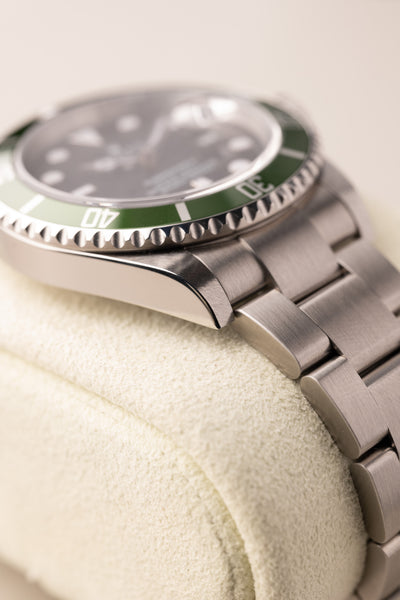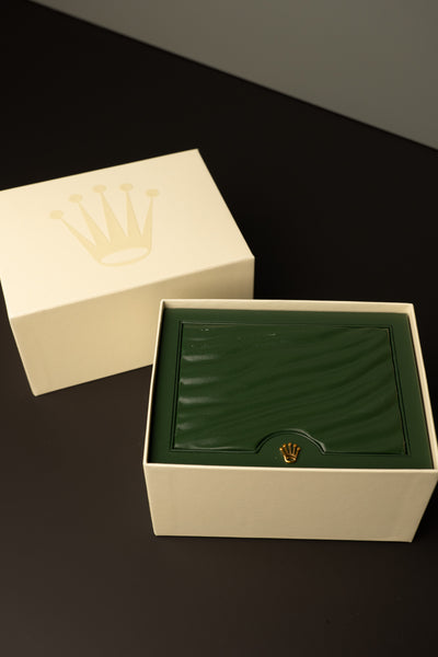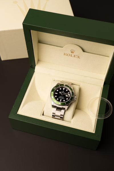 Description: 2005 Kermit Submariner. This is a rare Kermit that’s been left as NOS (new old stock) condition. Original stickers are all around the watch and the original Bezel cover is still on. This will be one of the cleanest Kermit Submariners you’ll see from early 2000’s. Watch with original Box & Card and accessories. This is one of those watches that will likely be tucked away in a safe and appear in auction in another decade we feel like, however part of us wishes someone will rip off the stickers and wear a brand new Kermit as a daily watch :)