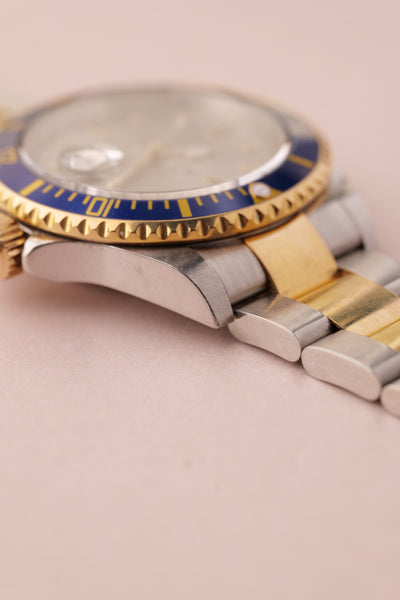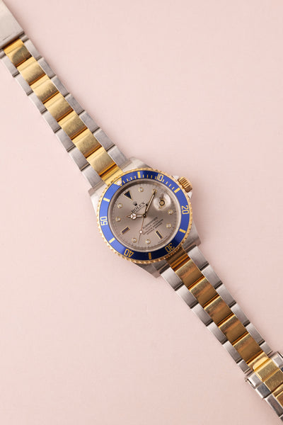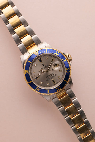 Description: Long overdue to have its moment in the sun, Serti-Dial submariners are the next watch to get a huge resurgence. White its two tone case and bracelet coupled with its metallic dial adorned with diamonds and sapphires, these neo-vintage sub’s certainly do not take after anything else Rolex has made. Case appears unpolished