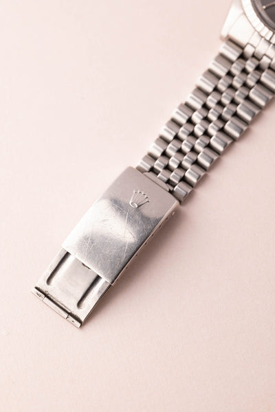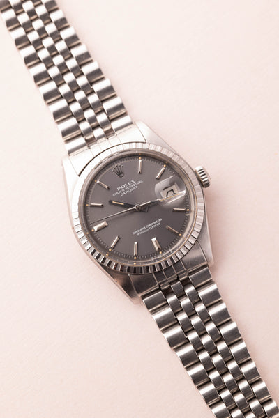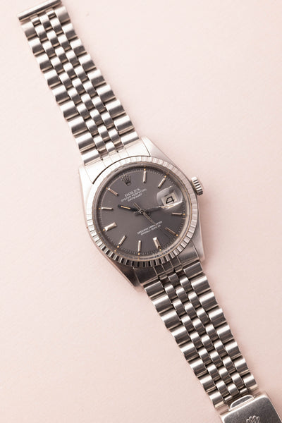 Description: The 1603 Datejust has seen a tremendous jump in popularity as more and more people are appreciating the versatility of Rolex’s 36mm premier offering. The dial is immaculate and retains all the lume plots. The sigma dial is a rare offering only produced in few quantities and finding grey sunburst dial’s like this are a rare treat. The case condition matches that of the dial and is very very thick as well.
