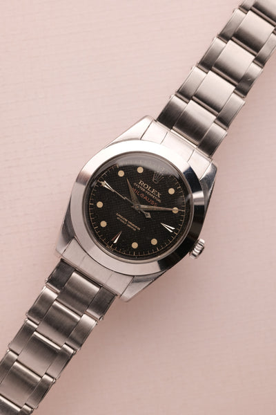 Description: This 1958 Rolex 6541 Milgauss is the collector’s grail. As vintage Rolex’s become more common in the public eye, and Paul Newman’s are becoming more common place in executive board rooms, there leaves very little “under the radar” watches that are truly rare grails. Make no mistake, the 6541 is the ultimate vintage sport’s Rolex watch. Launched in 1958 the first release of the Milgauss is indeed an oddity. The carbon fiber looking weave dial and the lightning bolt hands as well as the 37mm case leads one to believe the watch could be from the 2000’s rather than a mid century classic. The name Milgauss implies (mille (Latin for a thousand) and gauss, the unit of measurement for magnetic fields. As such, the watch is Rolex’s first stab at an anti-magnetic watch targeted for engineers, doctors, technicians that worked in environments with strong magnetic fields.