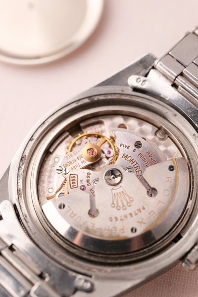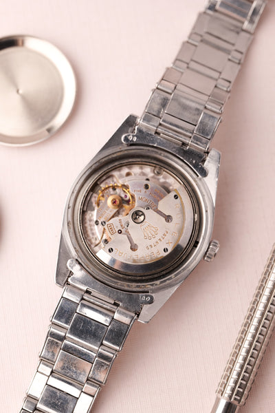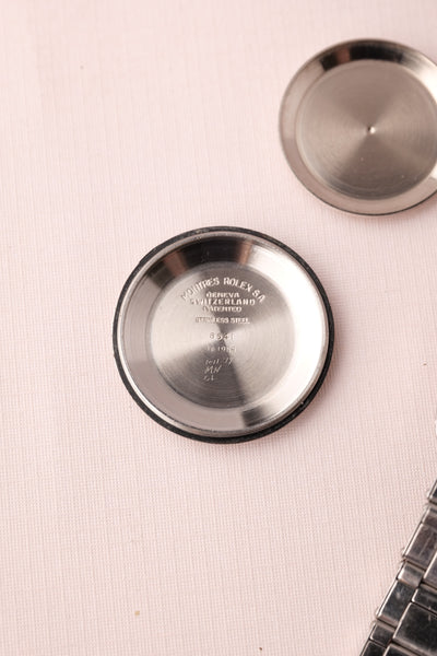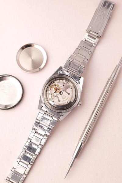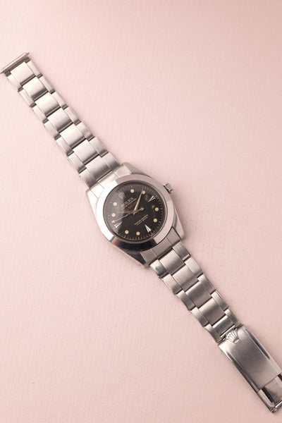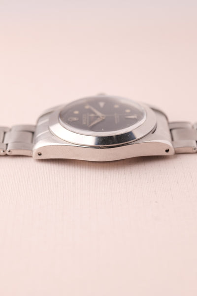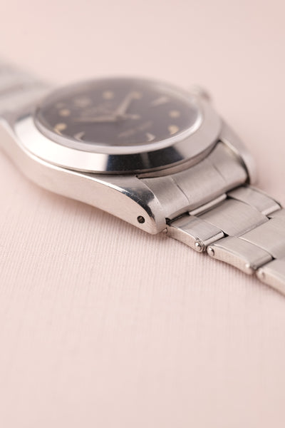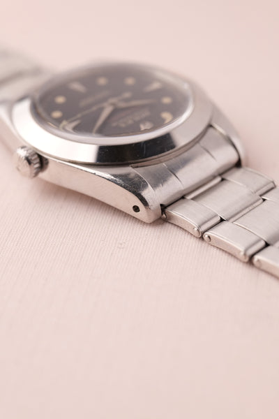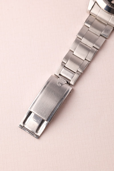 This watch appear is a rare configuration with a non-lume dial and hands. It has a smooth bezel as opposed to the black sports bezel that some came with. The case appears to be a sleeve polish with the original bevels still present. The bracelet is period correct and is a beautiful matching stretch rivet oyster. With auction prices for the 6541 climbing year over year, it won’t be long until touch the half million dollar mark.