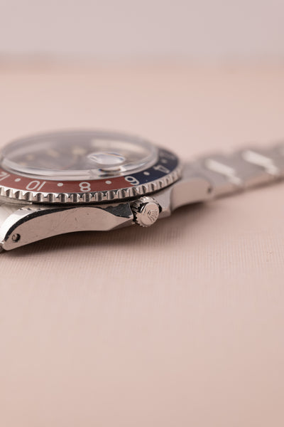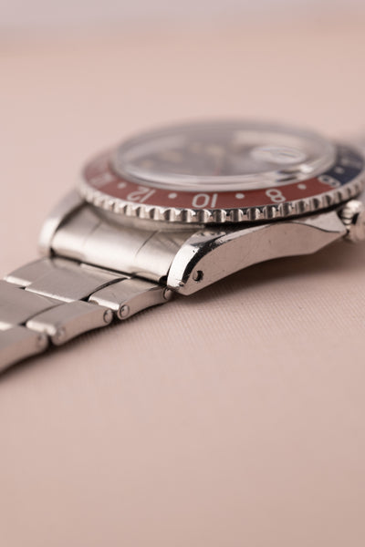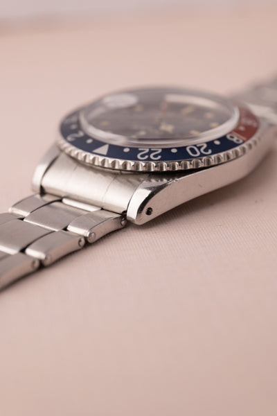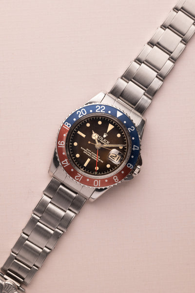 Description: Perhaps our favorite dial variant of the 1675 is the Gilt glossy dial with the encircled Chapter-Ring variant. These dials only appear correctly on the early 60’s GMT’s. We could stop there and we think we would have your attention, but wait there’s more. The gloss dial is free from any major detracting blemishes. These gilt gloss dials are plagued usually from tool marks or mishandling over the years and are less tolerant to shaky, uncareful hands. But wait there’s more, this dial in particular has turned tropical. What this means is that these dials have aged to a brownish hue. This is mostly seen in watches that have lived near hot environments or near the equator, those with “tropical” climates as it seems. The case appears unpolished and retains the original bevels as well. We could say more, but it would do no justice to this watch.
