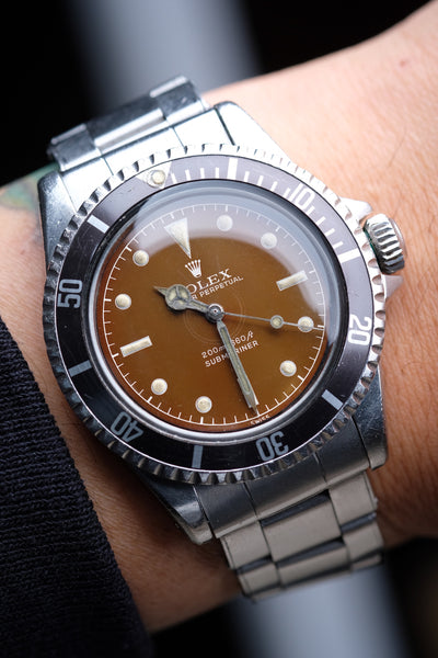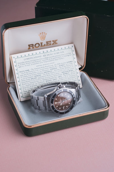 Description: Perhaps the nicest tropical Submariner we’ve ever come across, this 5512 Tropical Gilt Chapter Ring Submariner not only has the nicest tropical caramel dial, but it also appears unpolished and comes with box and papers. We don’t know if we will ever come across another one as nice ever and although that would be a shame to think about, we were lucky to have this come through our hands.