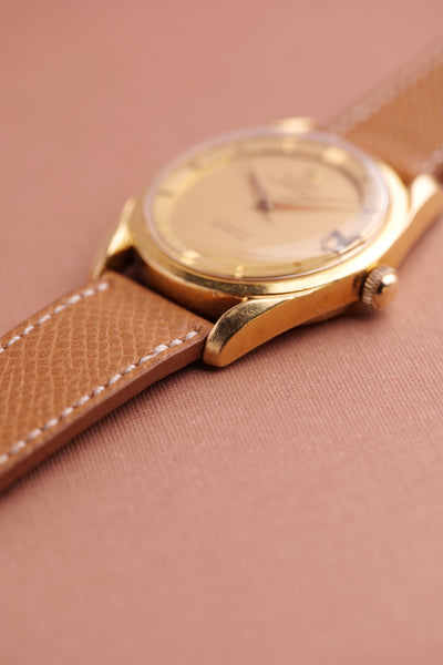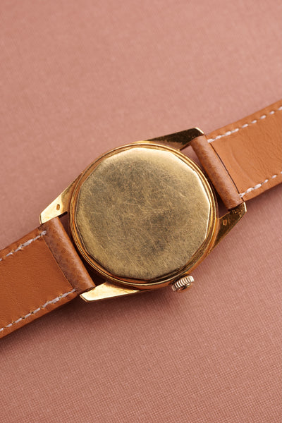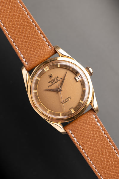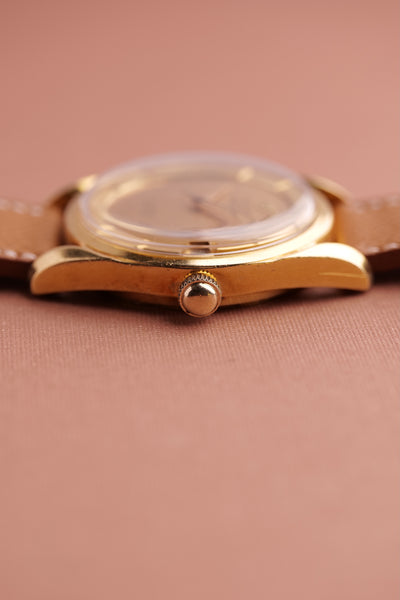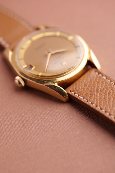 Description: This Polerouter is a quite-essential 1960’s watch. Don’t let the 34mm size fool you as this piece has a lot more presence than the size would dictate. The case appears unpolished with minimal wear. Winding crown seems to be a later replacement. No service history but the watch is keeping good time and date changes over at 12.