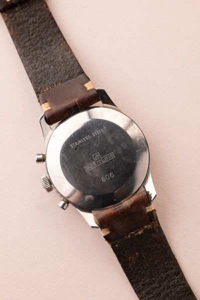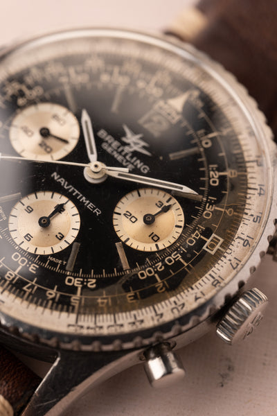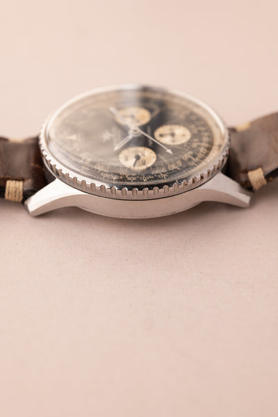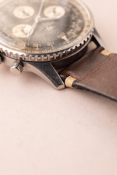 Description: This is a vintage 1960's stainless-steel Breitling Navitimer 806, On a leather strap with a domed acrylic crystal, and round chronograph pushbuttons. 40mm diameter solid three-body case, revolving knurled slide rule bezel, The case is in great condition with a light polish in the past. Full set box and papers along with a service paper.