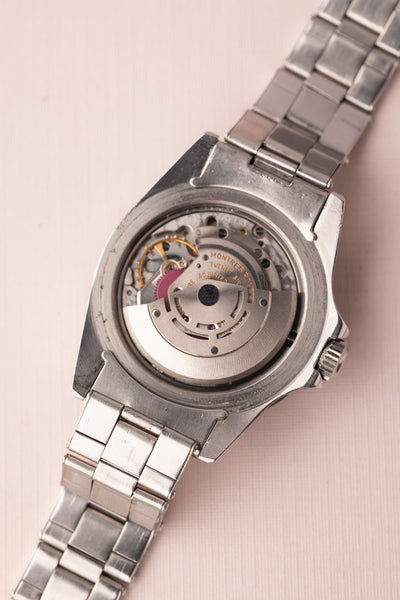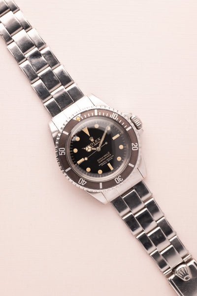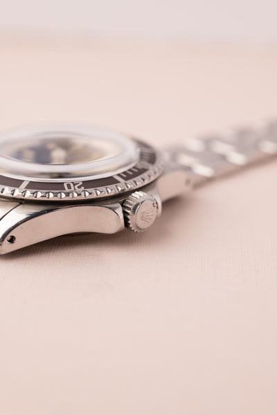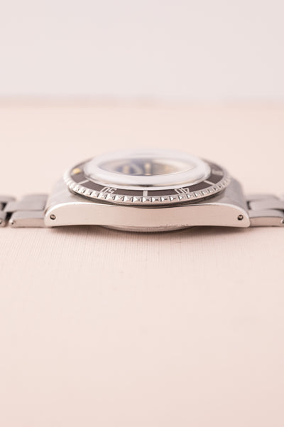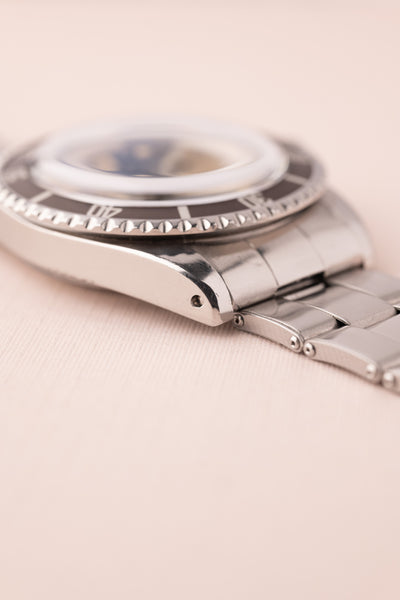 Description: The 5512 Submariner is the no-date variant submariner with 2 additional lines of text. This small subtle difference drives collectors to collect the 5512 over the 5513. Gilt dials are indeed another level of beauty among vintage rolex watches however seeing the gilt golden texts mixed with two lines of silver text is what truly sets this watch apart. The dial has a beautiful yellow saturation and complements the Lavender insert. The case is in excellent condition and the original bevels seem present which leads us to believe that this has had a sleeve polish over years of wear.