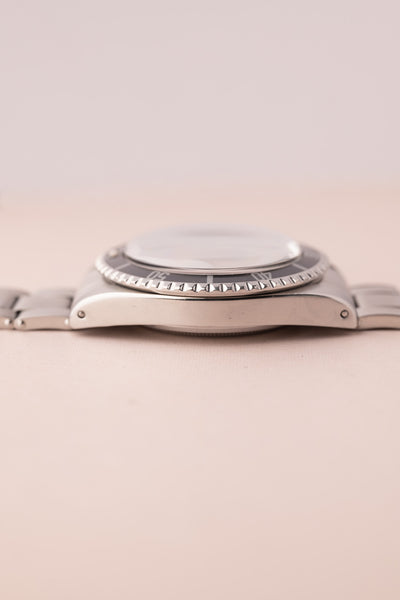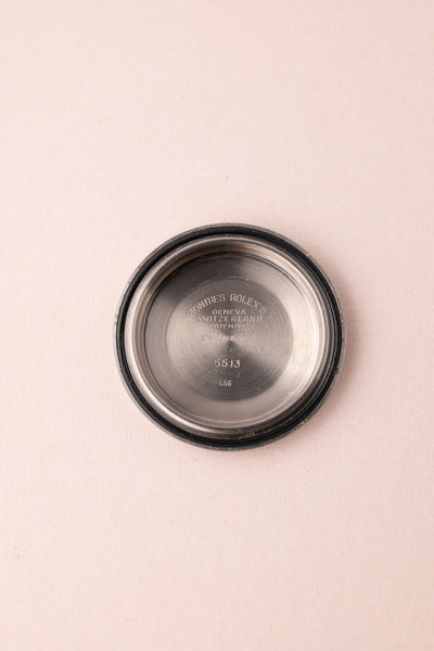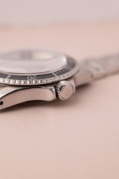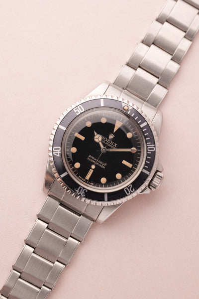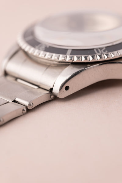 Description: Our favorite Gilt 5513 took place towards the end of the Gilt era dials. These dials were called the bart simpson dials as the crown resembled that character’s head and hair. These dials were also known to turn crazy tropical as seen on our previously featured leopard dial Submariner. However very few have a near flawless glossy dial like this one featured here. There is a small scratch near the hands but otherwise the lume and dial are excellent.