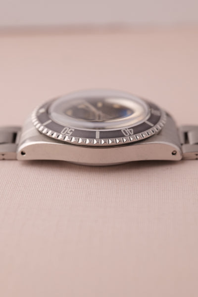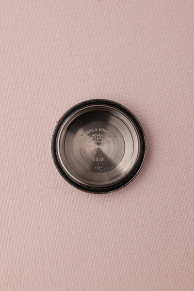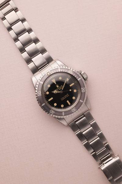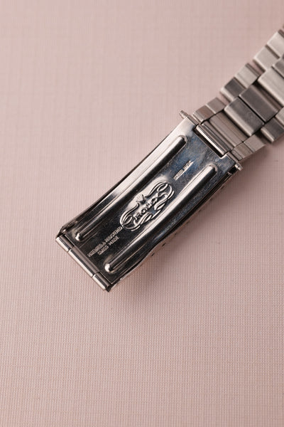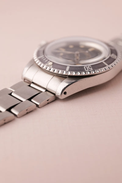 Description: We try not to get giddy when we see gilt ghost bezel Submariners, but these are always a special treat when they appear. The dial on this 5513 is a glossy gilt dial from 1965. It has some patina developing near the markers but it remains aesthetically pleasing from all angles. The patina on the Long 5 insert is nice and even and reflective for a genuinely faded ghost insert of this age. The case is in excellent condition and retains the original bevels. We believe this to be unpolished and properly worn through it’s life. The bracelet is a newer folded link bracelet.