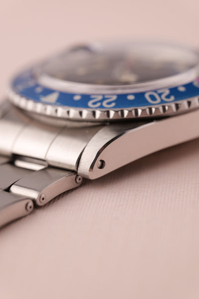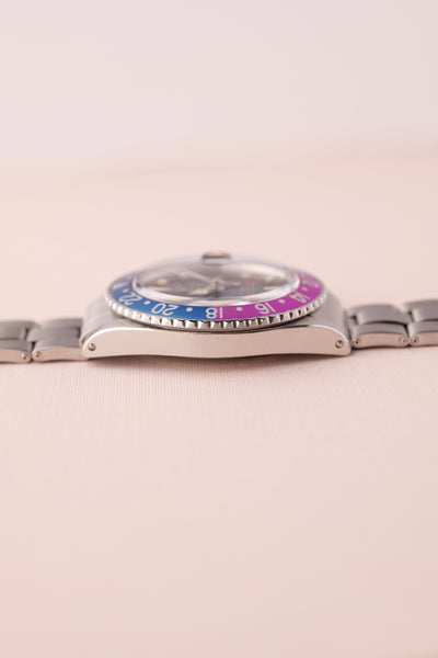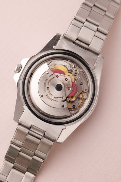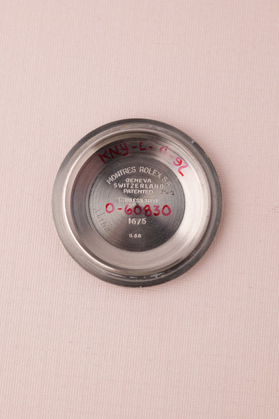 Description: To many that find the 1675 reference to be their favorite reference, the Fuchsia insert is a grail. These fuchsia inserts are only found in the Gilt or early MK1 ranges of 1675’s which is why this full set watch is all that much more special. Starting with the gilt and gloss dial, the lume is a bright yellow color and still reacts under UV as it should for lume of this age. The hands are original as well and are matching. The case is very thick and even and is in excellent shape as well. Two papers accompany this 1675; the original guarantee papers and the chronometer papers as well. Two tags are included as well along with the original box. For those searching for a top collector set Fuchsia, look no further.