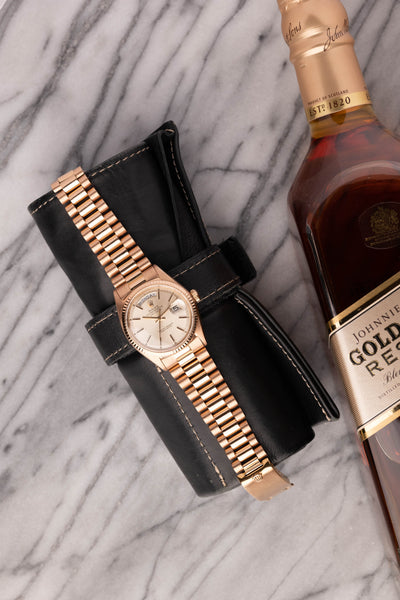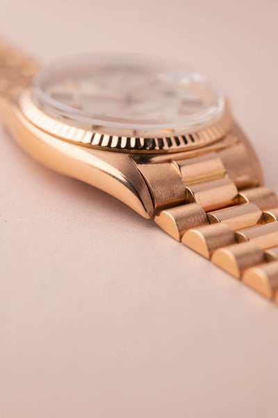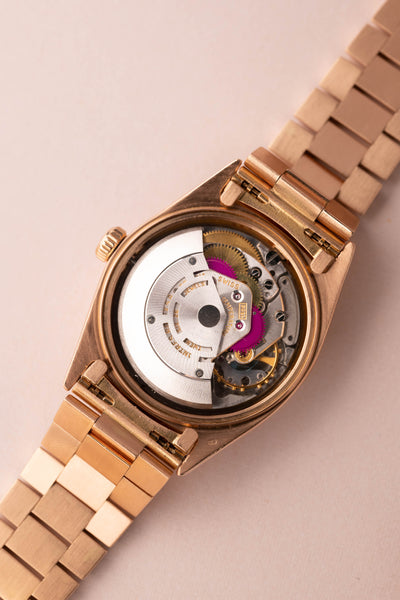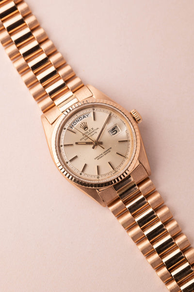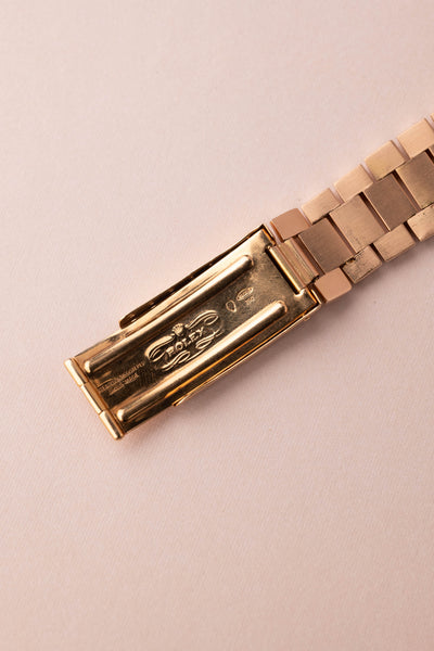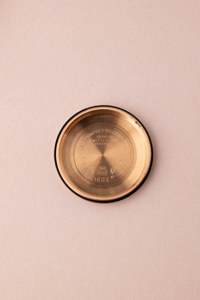 Description: A very early 1967 Rolex 1803 Day-Date made out of a very special Rose Gold alloy. These rose gold day-date variants are a unicorn in the 1803 world. Case has recently been polished but remains in excellent shape.
