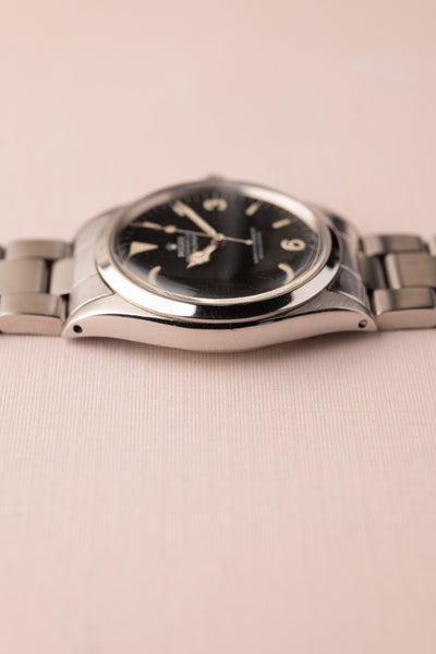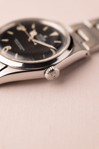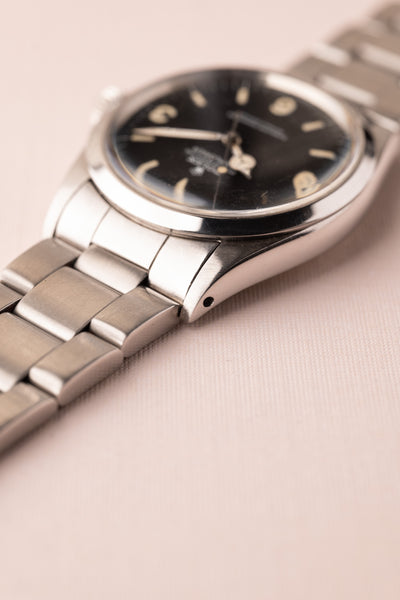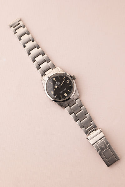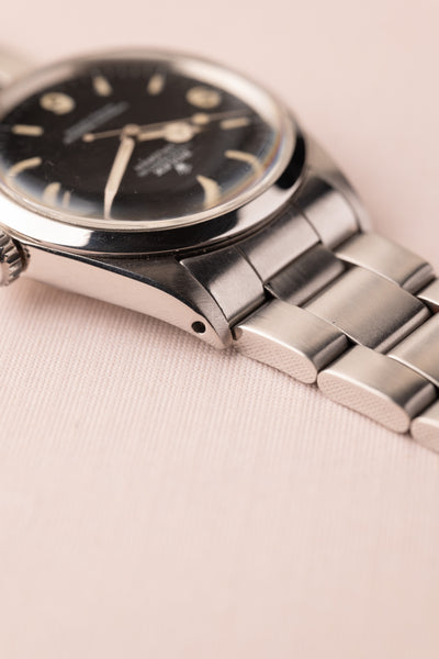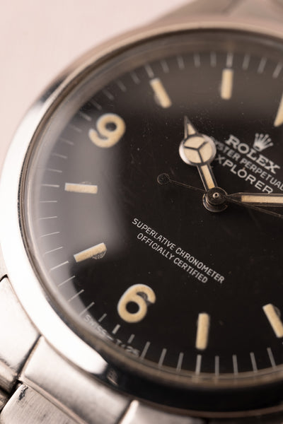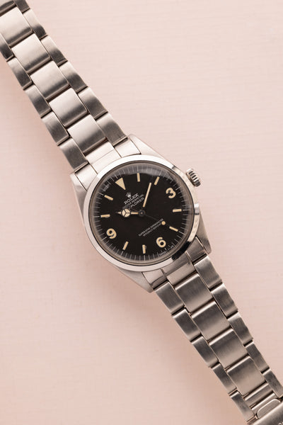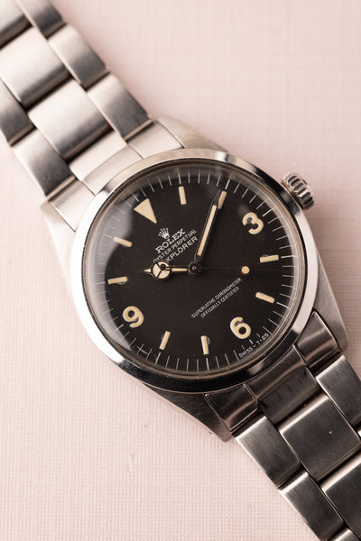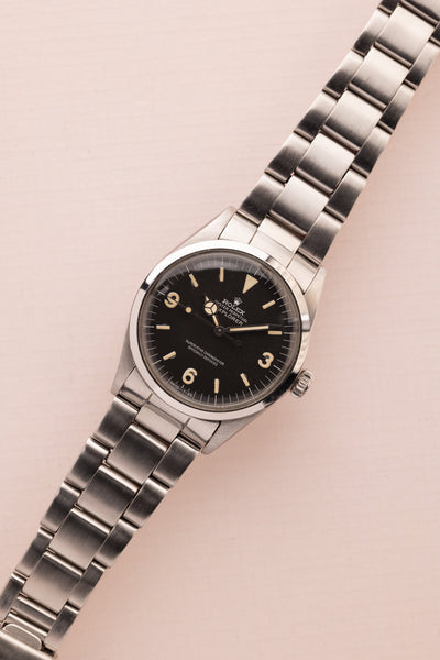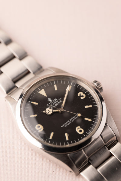 Description: We don’t typically stock many 36mm watches but we keep getting requests for this 1016. The Explorer 1 is bigger than the size may suggest and the smooth bezel draws your attention to the amazing 3-6-9 dial. Excellent Explorer I creamy matte dial. The case is in excellent condition as well matching the dial. The bubbly tritium lume is a characteristic of this late 60’s frog foot dial Explorer and when encased in a excellent case like this we don’t expect this one to last too long