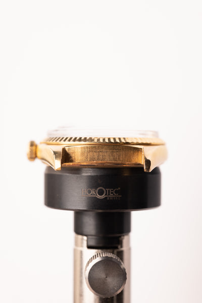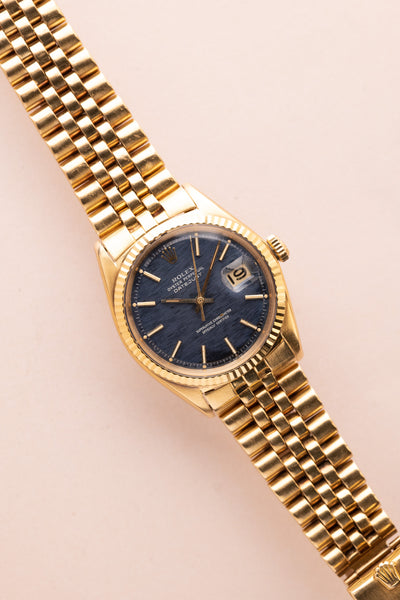Description: The 1601 datejust was mostly known as an all steel watch. There are a few examples that were made fully in precious metals and few and dar between that host an illusive blue mosaic dial. The brick like pattern of dark and light boxes create a glimmering effect when seen in direct lighting