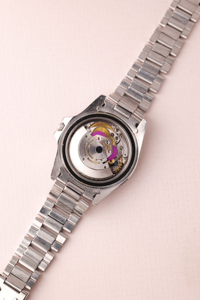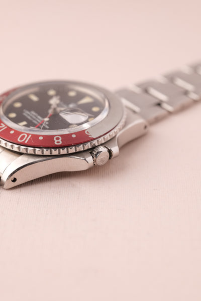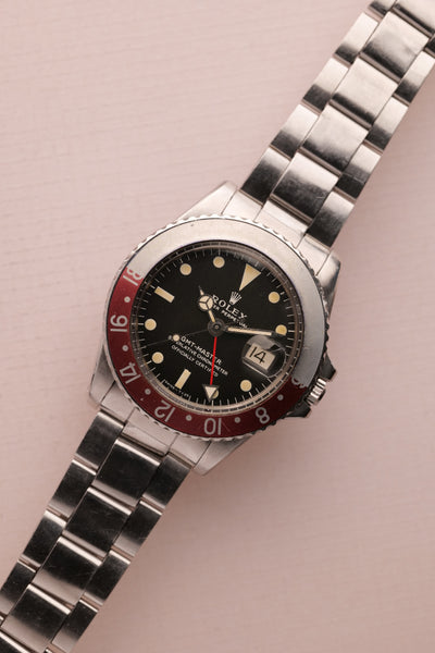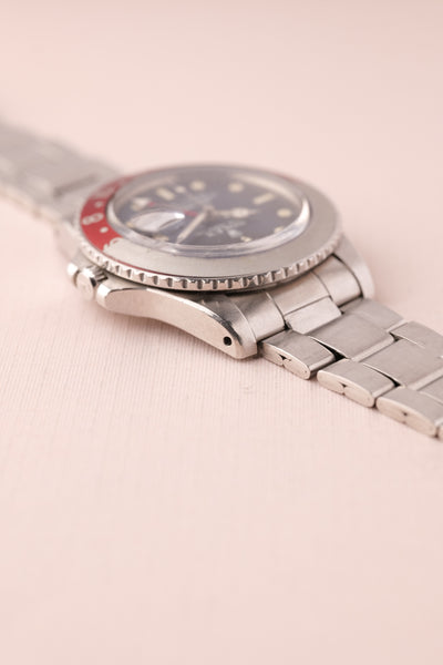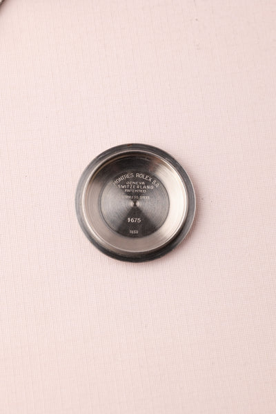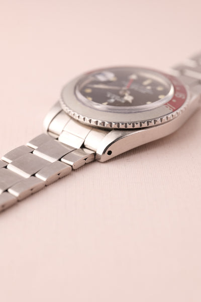 Description: 1968 Matte Dial 1675 GMT with period correct MK1 Dial. Insert is a faded pepsi ghost insert fat font. The case appears unpolished having very thick and sharp bevels and lugs. The bracelet is period a period correct folded link oyster bracelet. Dial is beautiful with a bright yellow patina on the lume plots. This one ticks all the boxes.