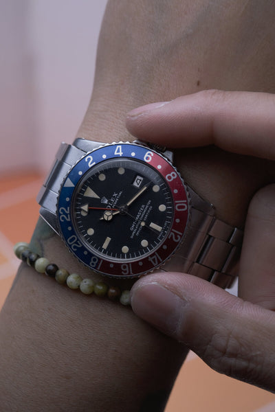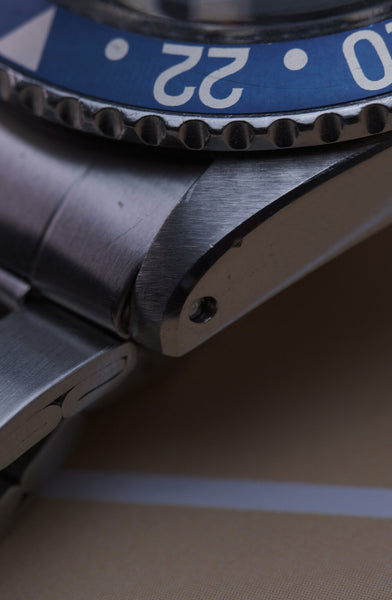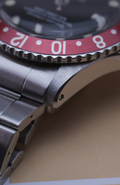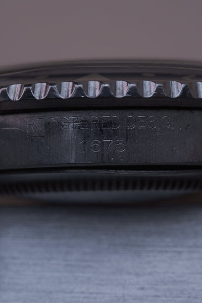 Description: Early 1970 Matte Dial Pepsi GMT with correct “Long E” Mark 1 Dial. The 1675 GMT remains one of the most iconic references in the storied GMT lineup. The Mark 1 dial is characterized by the long middle prong of “E” in the “rolex” text. The case is in excellent condition and leads us to believe those are the original chamfers that came with the watch. The fat font Pepsi insert has slightly faded yet remains very saturated with bold colors. This GMT is also installed with a Tropic 38 crystal which is a correct no cyclops domed crystal. These crystals are very rare and have skyrocketed in value. This is a collector grade piece that is sure to gain in more popularity.