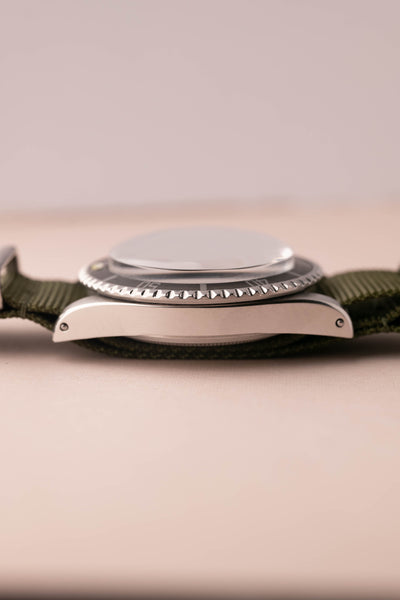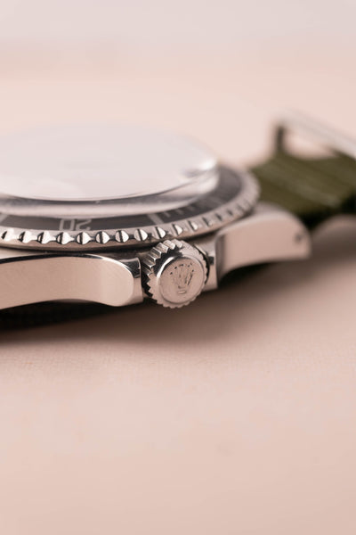 Description: The matte dial, meter’s-first variant dial is one of the most collectable vintage submariners out there. Known for a period in time where Rolex’s sales were not primarily in North America, the metric standard was prioritized and thus “200m” came before the American Standardized “660ft” measurement. This quickly changed as the consumption of Rolex watches in the United States ramped up surpassing European sales. As a result the “ft-first” dial came in late 69 and carried forward to this day.