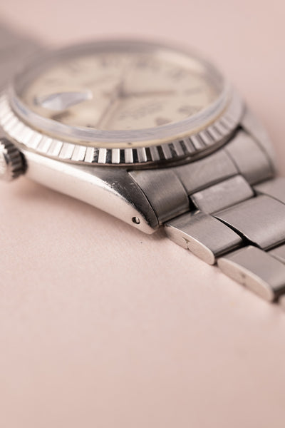Description: The Roman or “Buckley” dials are rare birds and this cream dial w/ black font is something we have rarely ever seen. The case is in excellent shape as well with thick lugs throughout. The lume is still present on the hands and the dial and has a yellowish tint to the plots.