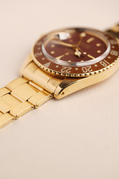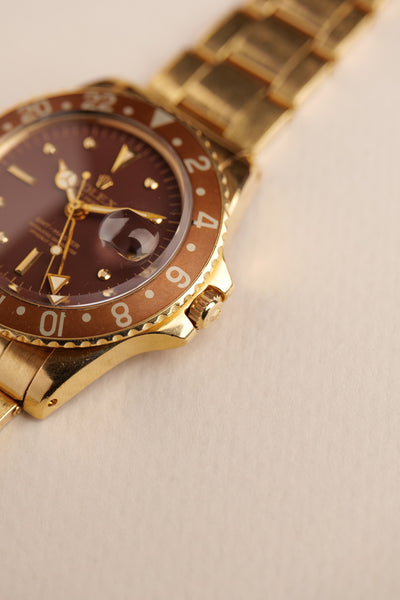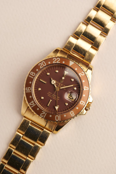 Description: Its no surprise that gold 5 digit watches have taken over by storm. So where does that leave 4 digit gold pieces? It’s safe to say that these have definitely climbed with their 5 digit siblings but as they were made in far fewer numbers, they have gone a bit under the radar as prime well kept examples are being tucked away in major collections. Out of all the gold GMT’s we feel the nipple dial rootbeer is our favorite gold sports model from Rolex. Proportions and heft balance out nicely as is the matte dial oxblood colored dial. If we have to explain the beauty of this piece, it is probably not for you.
