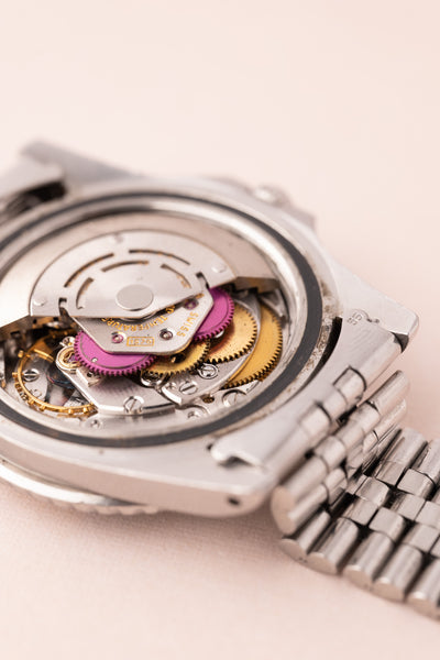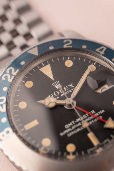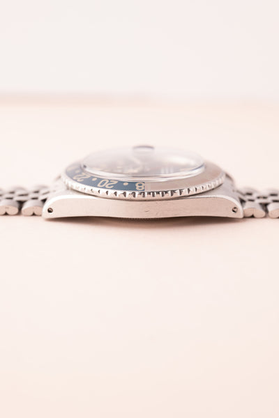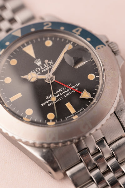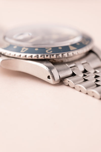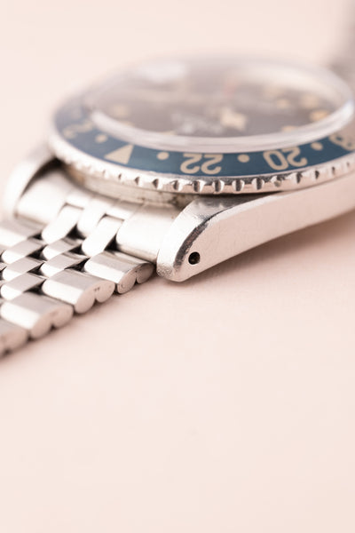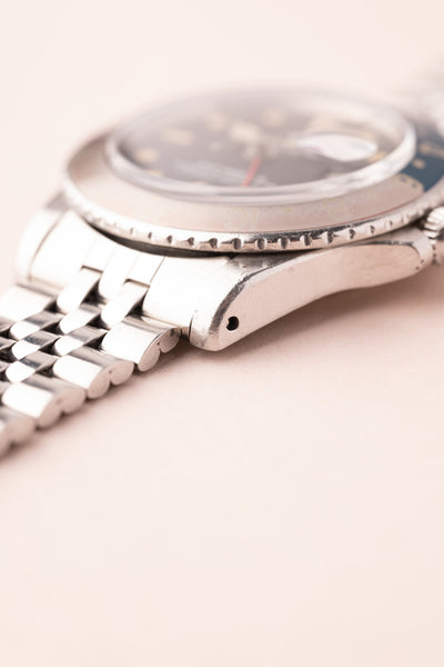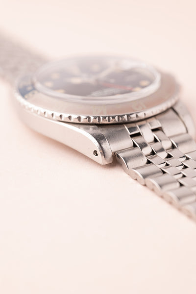 Description: Perhaps no watch is more versatile than a vintage 1675 GMT. This MK1 Long-E variant captures what vintage matte dial watches are all about. The Pepsi Insert coupled with the yellowish lume gives off an iconic look that can’t be mistaken for any other watch. The insert is a fat font faded pepsi red back insert. These MK1 1675’s are becoming increasingly hard to find in this condition.