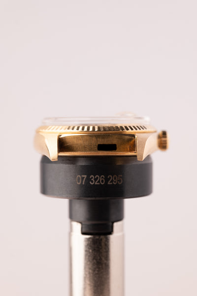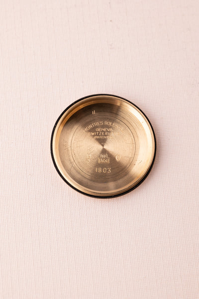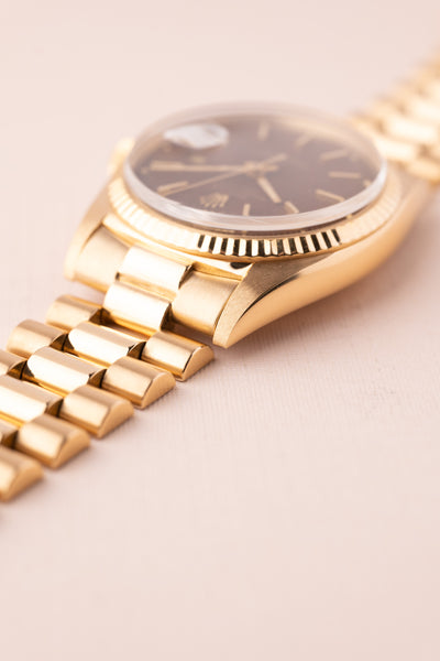 Description: One of the rare Day-Date dials is the brown confetti dials found in these 1970’s 1803 Day-Dates. The dial has a speckled appearance with brown, black and red specks. All the lume plots are full and unchipped. There is a spot of wear between the 8 and 7 o’clock lume plots that is at the outer edge of the dial. The case has been lightly polished but the lugs remain thick and even throughout. This is a beautifully preserved 1803