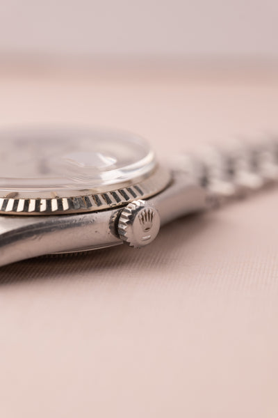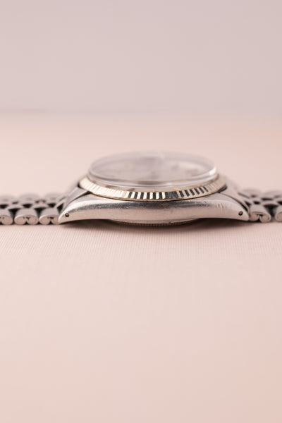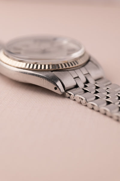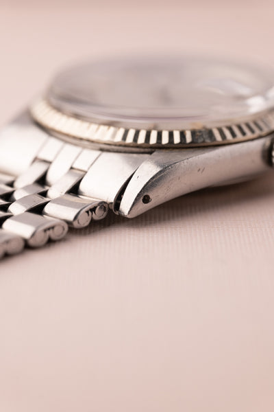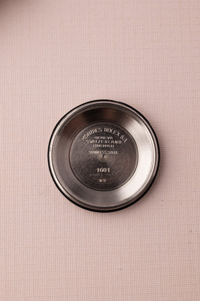 Description: A very rare 1601 London-Fog dial datejust. The text appears to have faded but is still visible.