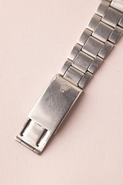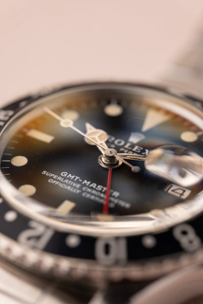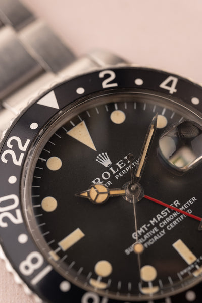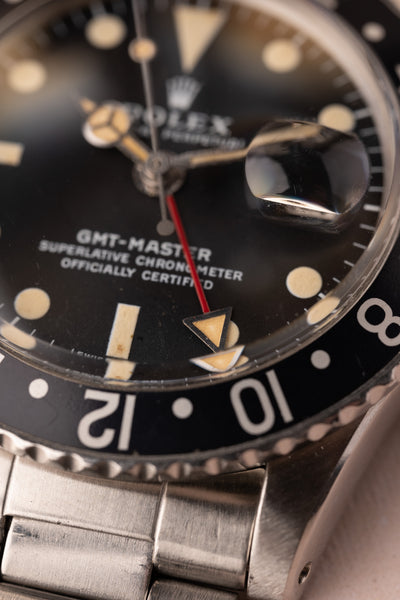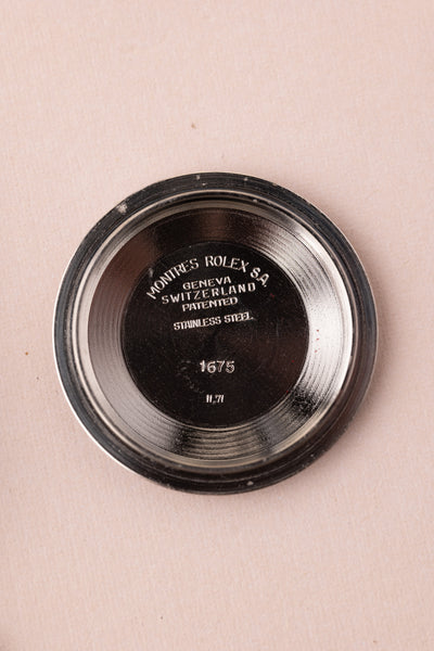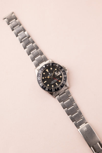 Description: Rolex Black Insert GMT with MK2 dial. The MK2 1675 is characterized by a fat L in “Rolex” This chunkier font leads to a pleasing contrast when coupled with the saturated lume plots. The case is also exceptional on this GMT given the look of the chamfers on the lugs. A folded link bracelet matches the year as well. The black insert makes the dial really pop and shows off the yellow lumes.