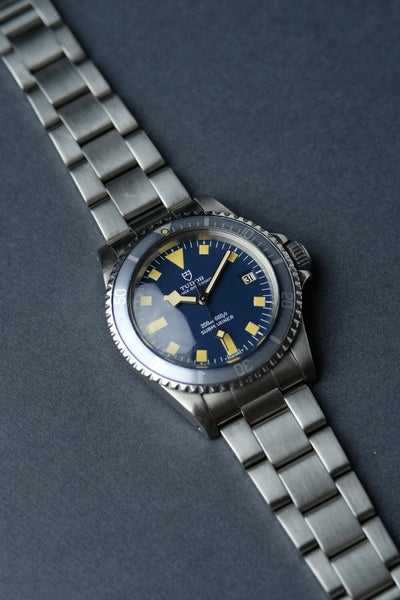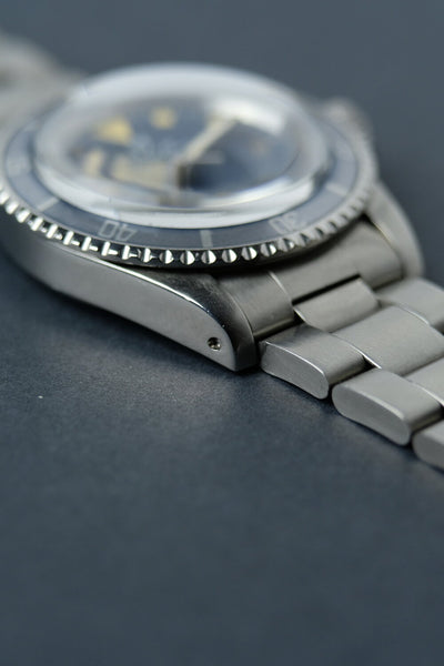 Description: Tudor 94110 Snowflake Submariner with excellent blue dial and ghost insert. This is a complete set Box and Papers Tudor Snowflake. It features an excellent faded satin ghost insert that pairs amazingly with the ocean blue dial and saturated yellow tritium markers.