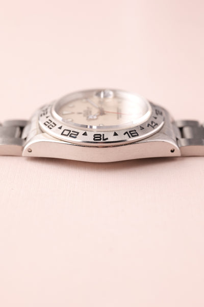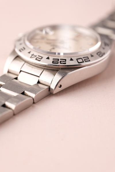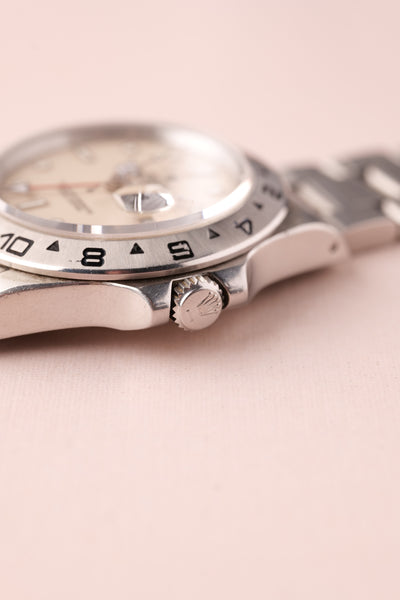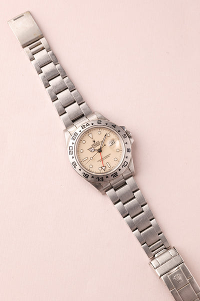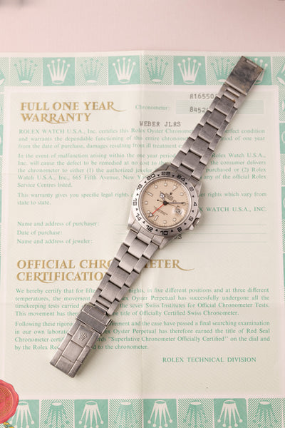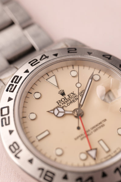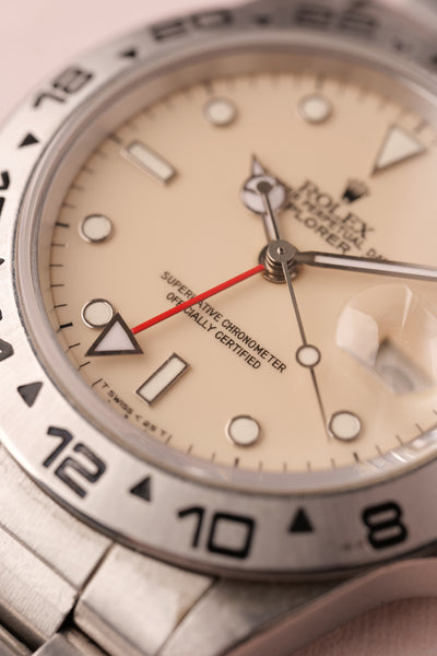 Description: Not all cream dial’s are created equal. There are only a few references that are known to turn out a cream dial. The 16520 and 116520 Daytona’s, and more famously the 16550 cream dial Explorer II’s. Perhaps what is more strange is that this cream variant that develops over the years on very few dials brings the value of this Explorer II above its cream dial Daytona counterparts. This watch in particular comes with papers and period correct box. It also boasts a very sharp and thick case that appears unpolished. Over the past few years these watches pop up seldomly and are rarely seen for resale again for good reason. The cream on this dial is also much more taupe in color than the other swiss cream colored Explorer