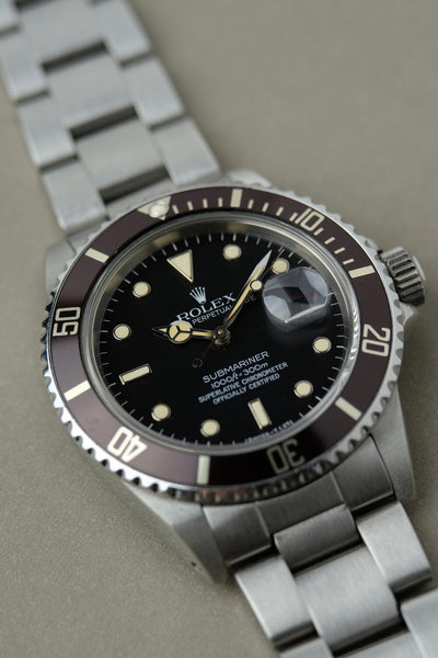 Description: 1985 16800 Submariner. This early WGS submariner hosts a beautiful dial that has sunbursting patina developing around the indices. The black bezel has begun to turn tropical into a nice brownish hue.