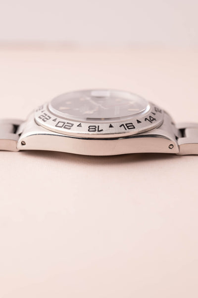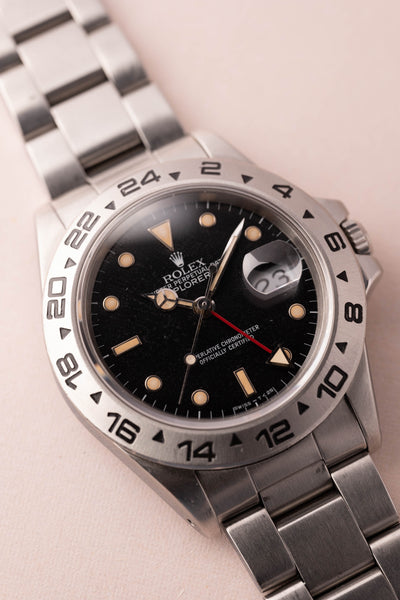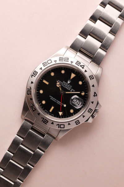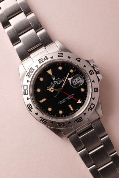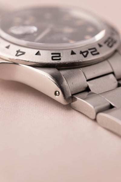 Description: This 16550 which is the first explorer 2 to be housed with a sapphire crystal. It also houses the 3175 movement, shared with the fat lady GMT. Its number markers on the bezel are also much more bold and pronounced than its 16570 counterpart. Are we splitting hairs here? Likely but that is the exact reason why we collect these vintage watches. The case has likely been polished in the past but is thick and even and shows some of its factory beveling. The Dial is nice and creamy and can be considered going tropical as there is some patina developing on the lacquer.