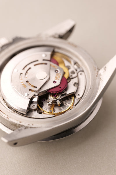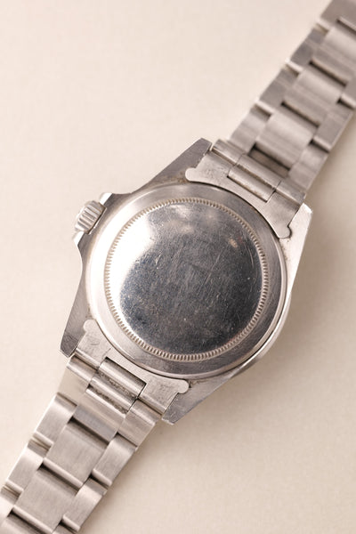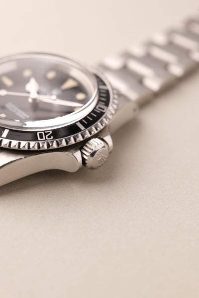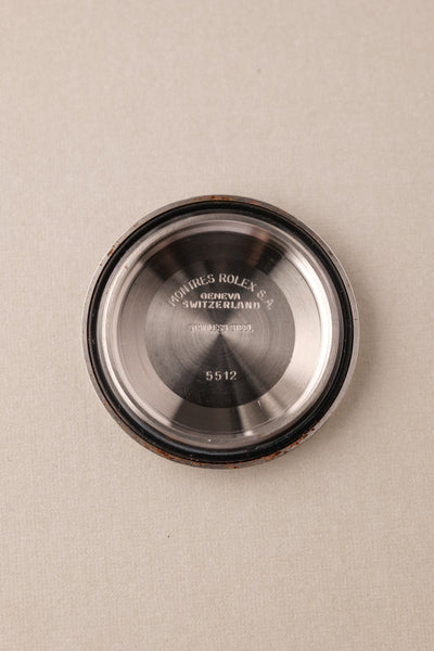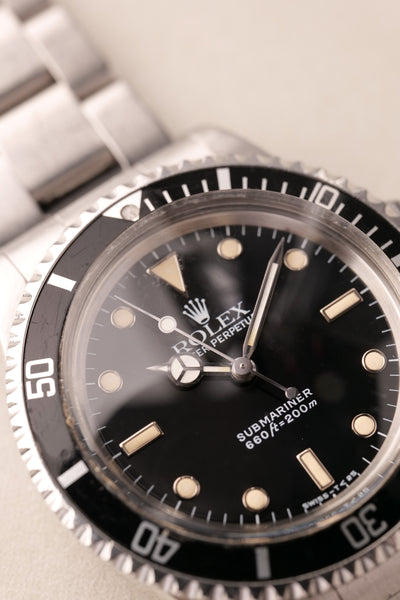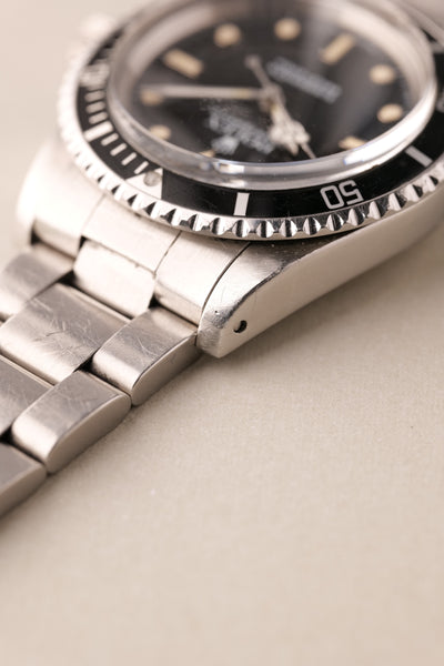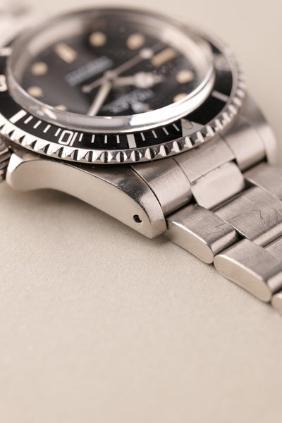 Description: 1987 Rolex 5513 Submariner , transitional white gold surround dial. This transitional 5513 houses the white gold surround glossy dial while in the vintage 5513 body with plastic dome crystal. This combination makes for some of the rarest Sub’s out there as they were only produced for a couple of years before the introduction of the 14060 body. Case is in great condition and appears unpolished with thick and even lugs all around.