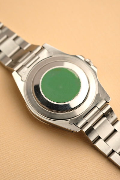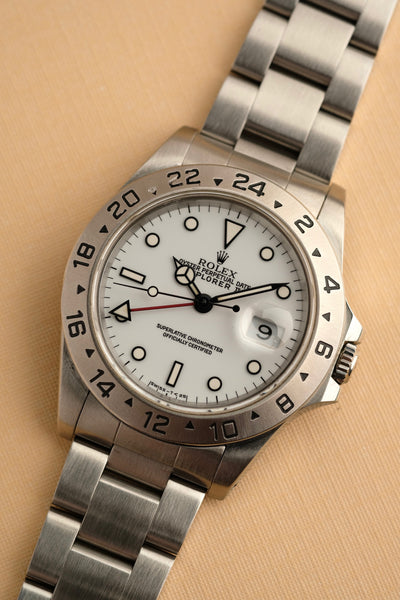 Description: This polar white dial 16570 has seen tremendous appreciation in 2020. Rolex was not known to make many all white dials similar to this Explorer and as such, these polar explorer 2’s have picked up quite the following. The case is very thick and retains the caseback sticker. Unlike the luminova or swiss only dials, the Tritium polar variants show off the yellow tritium the best as there is a stark contrast between the lume and the very white dial.